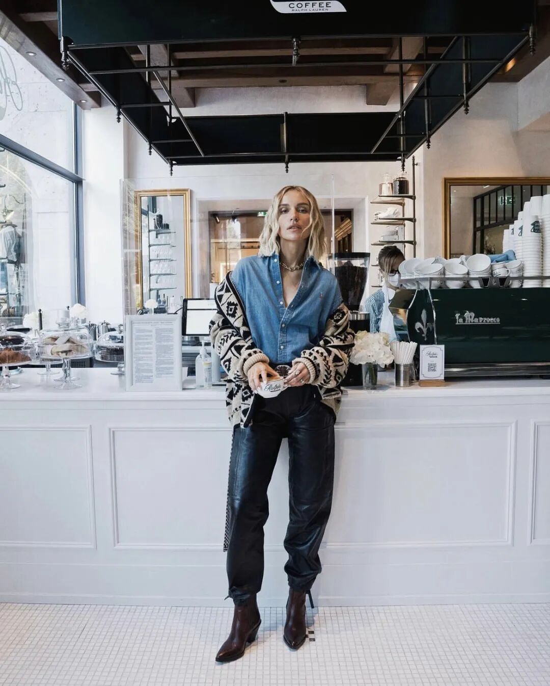 同屬於 “強硬派” 的皮褲,跟牛仔襯衫搭配也不錯。試試這對新搭檔,會帶來意想不到的驚喜。