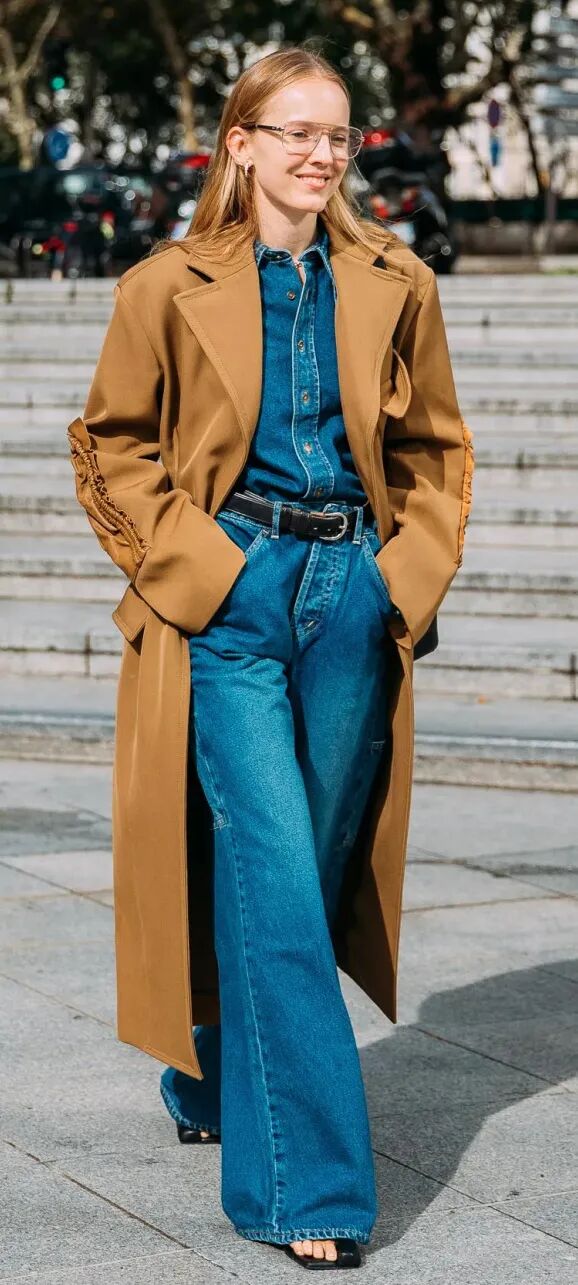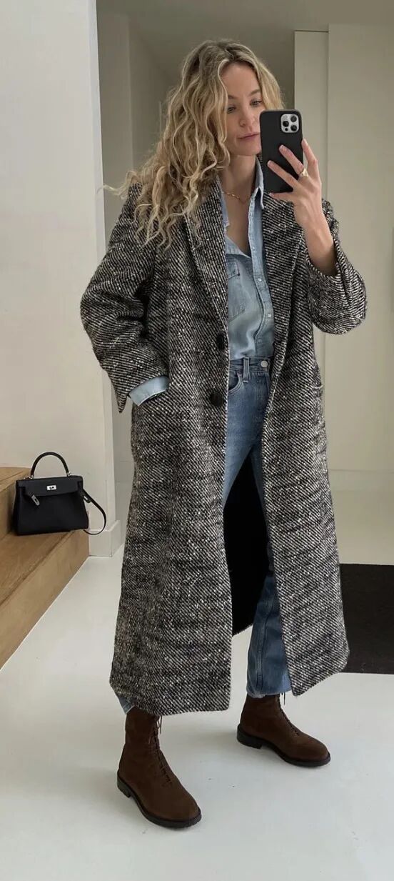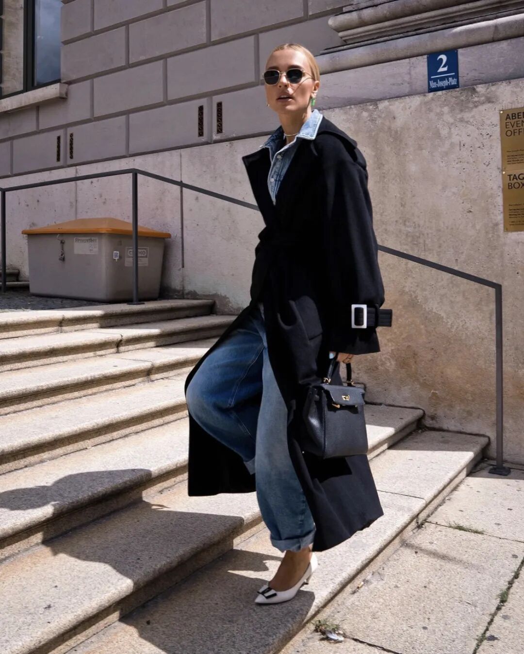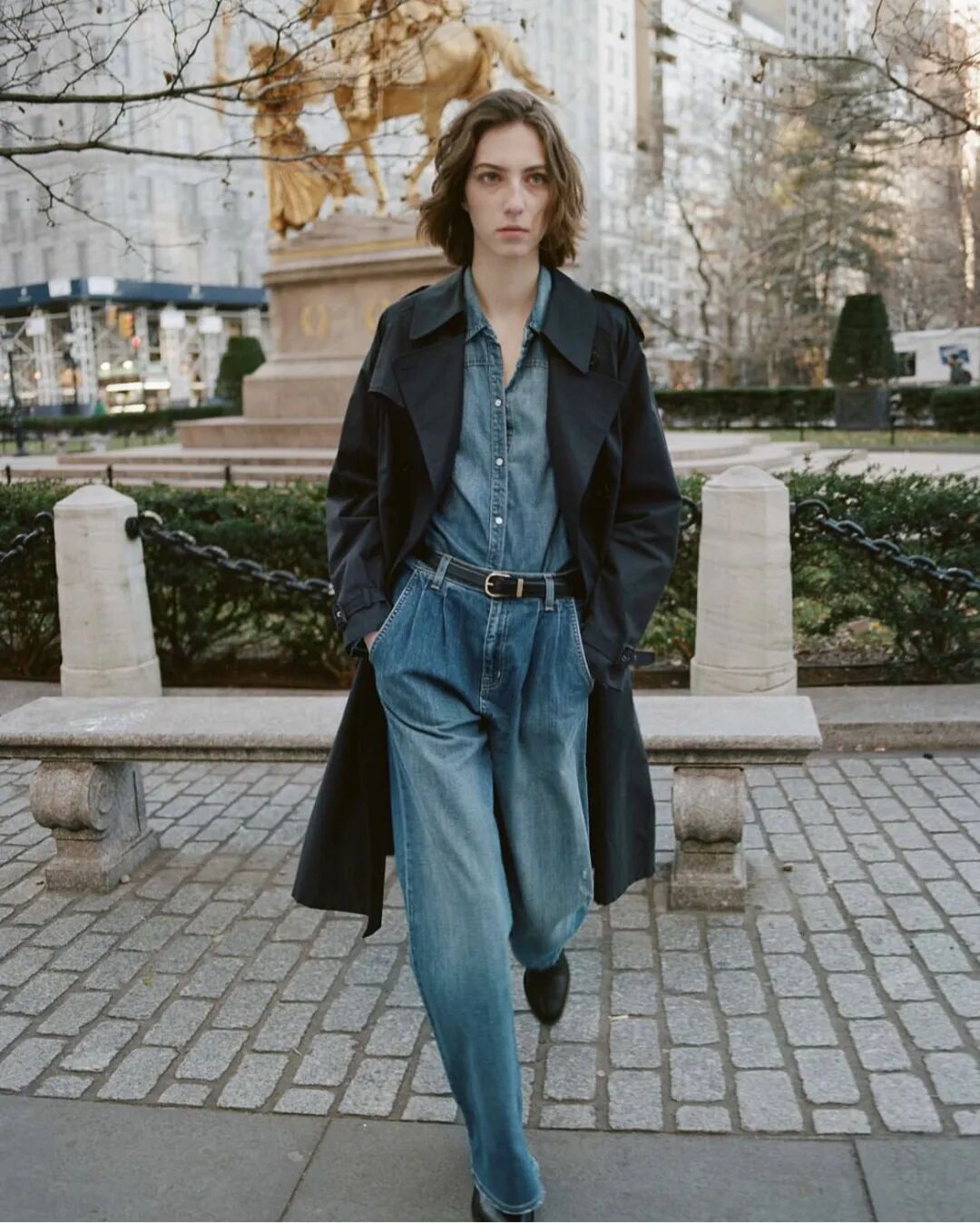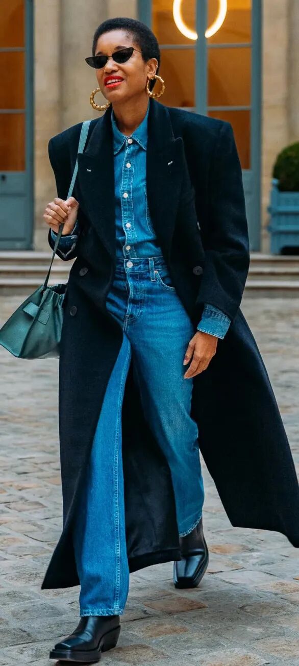 北方的同學還是得把大衣安排上。尤其是寬肩長款大衣,配牛仔襯衫+牛仔褲氣場十足!
