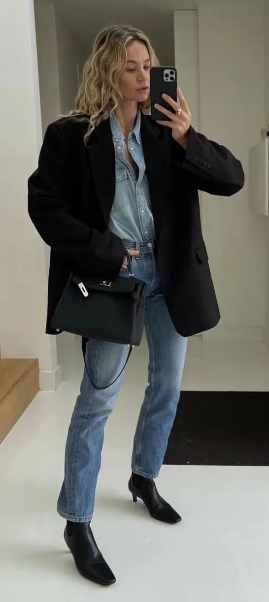 荷蘭博主 Anouk Yve 提供了一個基本思路:準備好一套(較合身的)牛仔襯衫+牛仔褲,在此基礎上加毛衣或外套,就可以了。