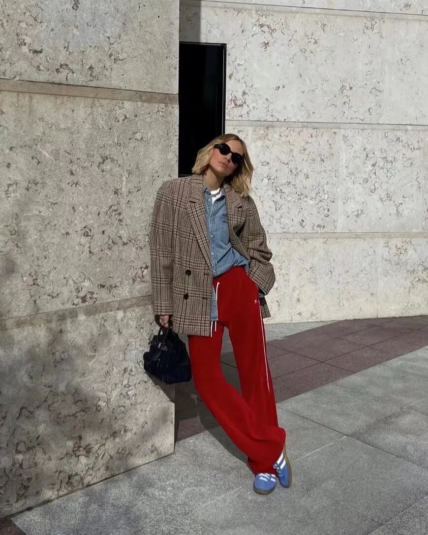 更進階的版本,是在牛仔襯衫+運動褲的基礎上,“玩轉” 色彩碰撞和層次疊穿。像是牛仔藍 × 紅衛褲的組合,單穿也足夠醒目。