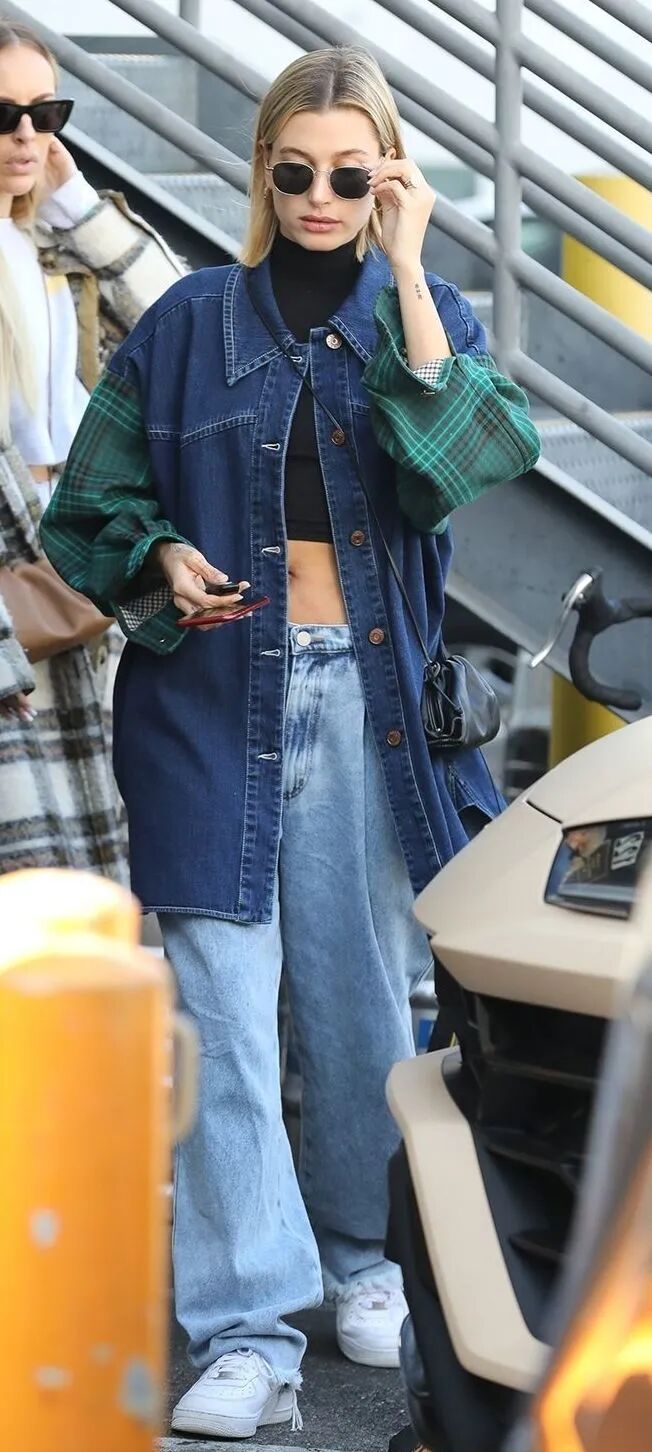 牛仔襯衫在 Hailey 街拍中也很有存在感,配超短 Tee、搭牛仔褲,讓 Denim 裝扮更多了幾分酷酷的街頭感。