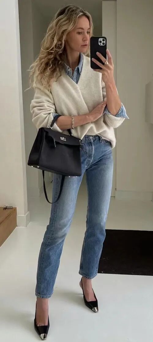 荷蘭博主 Anouk Yve 提供了一個基本思路:準備好一套(較合身的)牛仔襯衫+牛仔褲,在此基礎上加毛衣或外套,就可以了。
