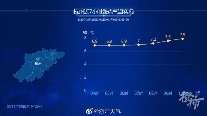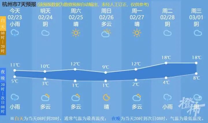 杭州市氣象臺預計,未來七天杭州晴多雨少,小雨天氣出現在今天(23日)傍晚到明天上午、3月1日,其中今天后半夜臨安西北部高山區有小雨夾雪或小雪。