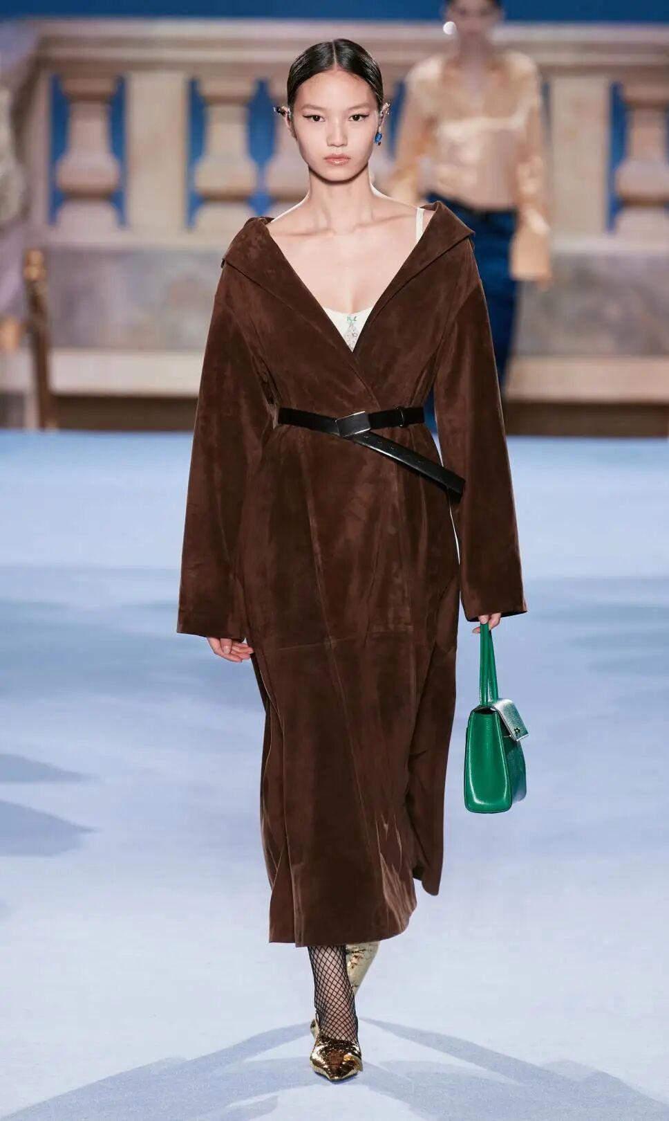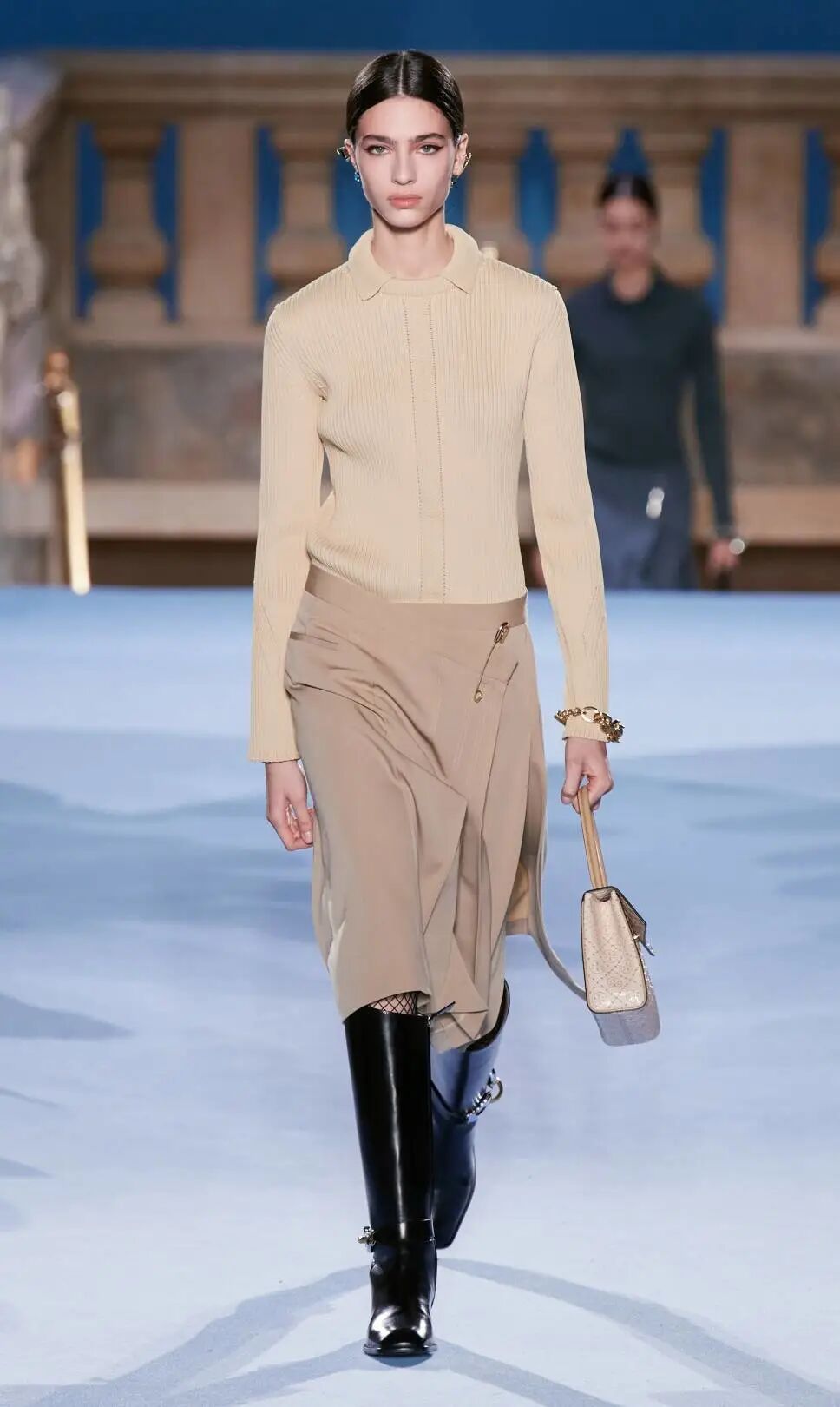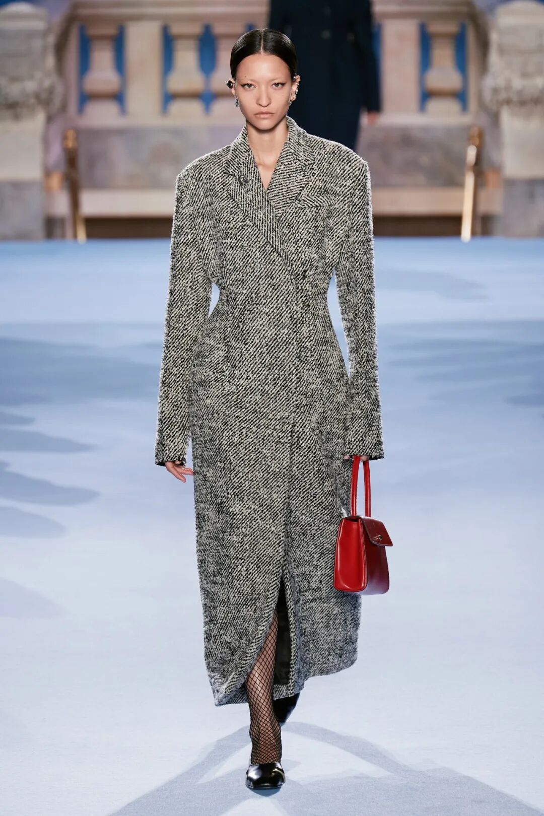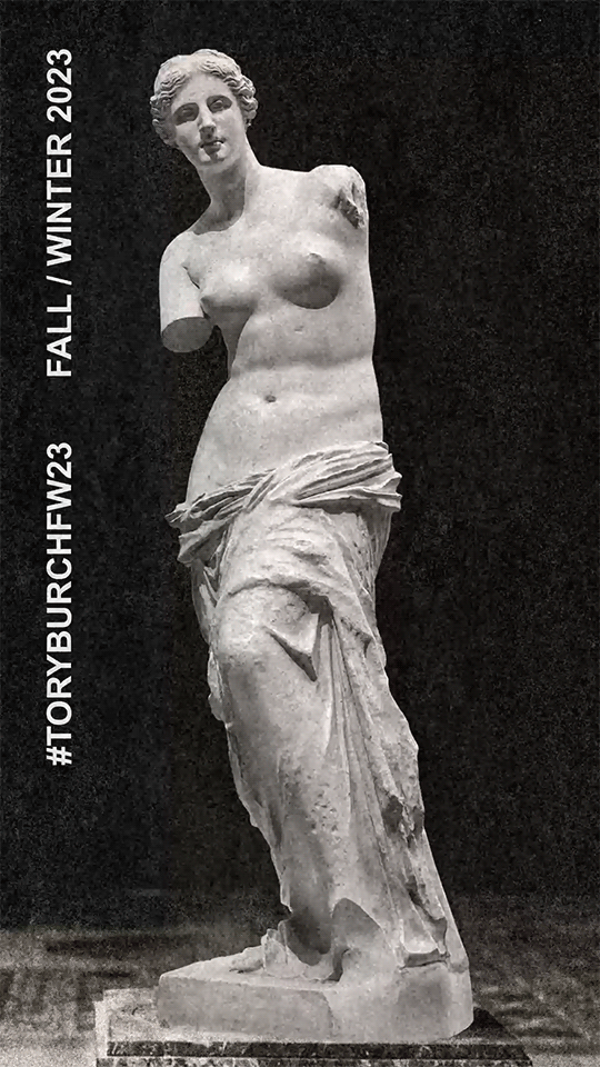 Tory Burch 2023秋冬系列大秀的地址位於紐約下東區錢伯斯街51號,大秀開場前全場柱廊上投影著扭曲的斷臂維納斯圖片,這尊古希臘雕塑是女性魅力的不朽象徵,訴說著直抵永恆的缺陷美與力量。