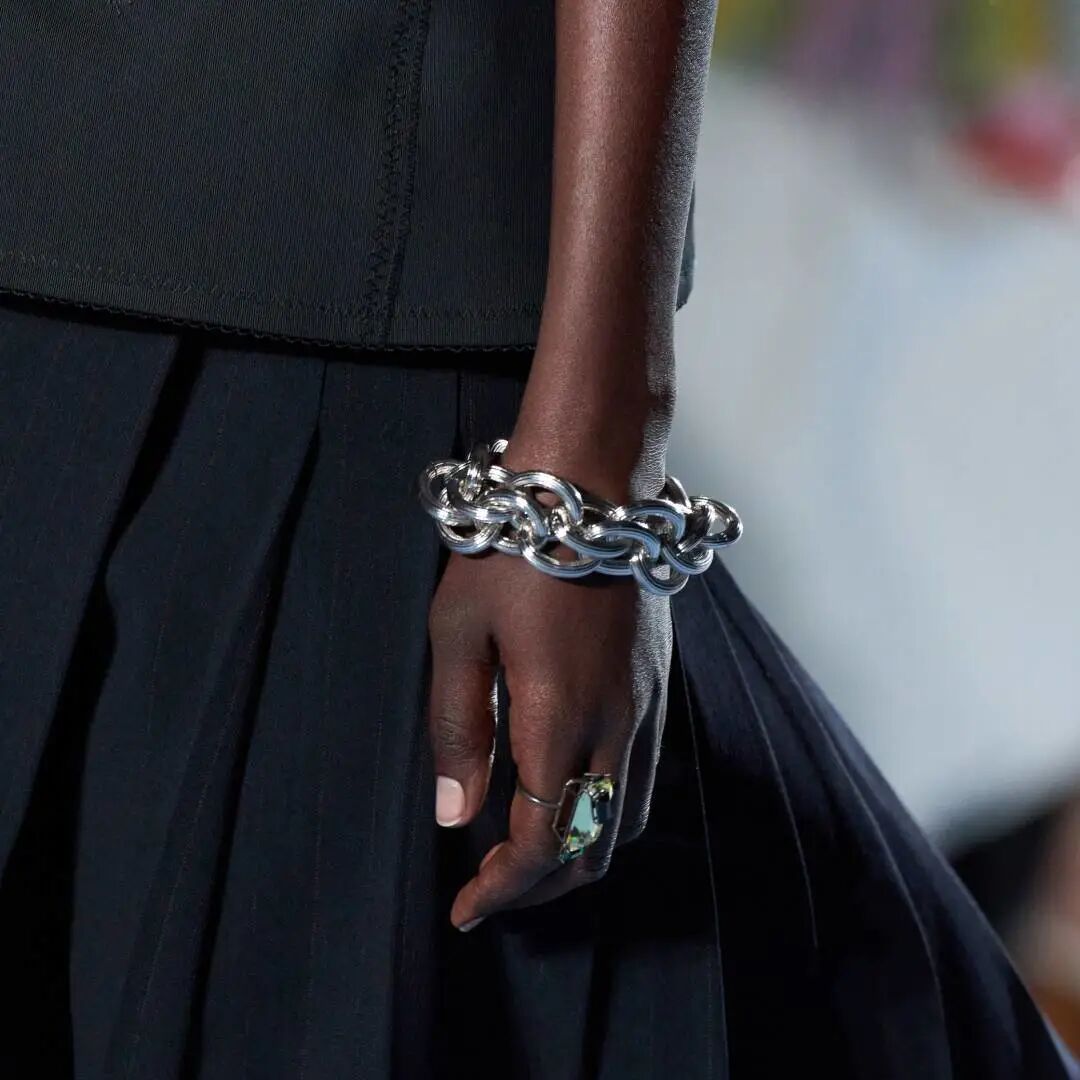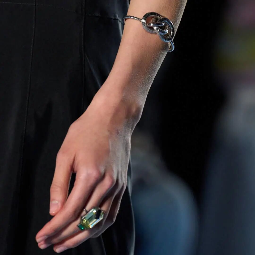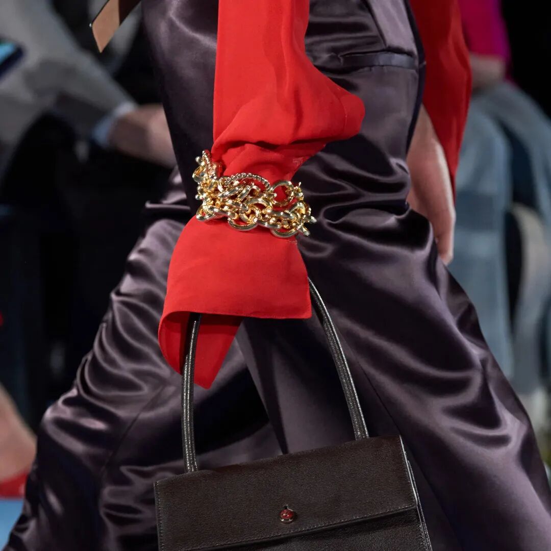 本季的珠寶配飾多元混搭極簡現代,金屬粗鏈條手鍊,即是手鍊又可以當包袋裝飾;鑲嵌多色寶石的戒指和耳飾,演繹極簡摩登造型;安全別針造型的耳飾,新穎別緻又極具視錯感。