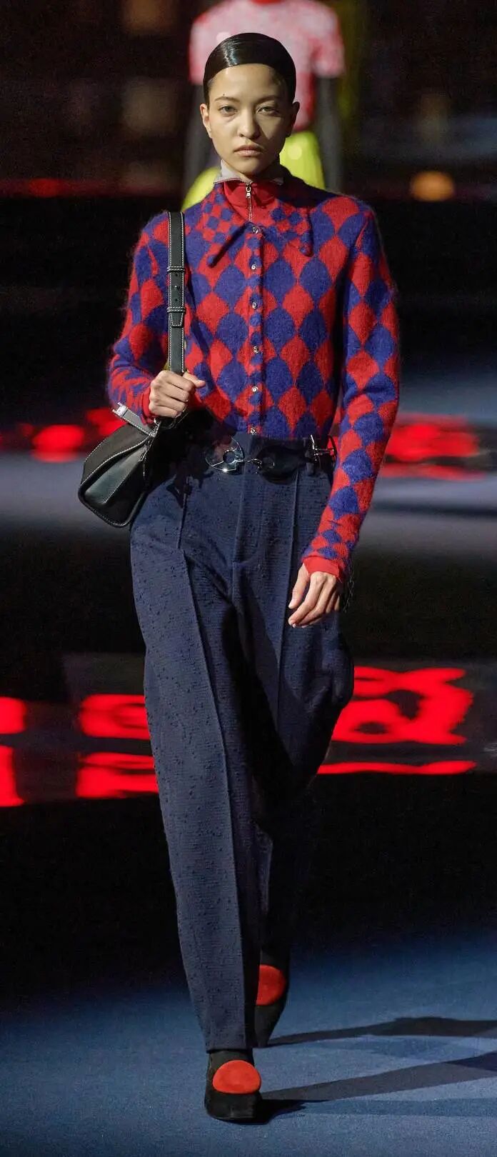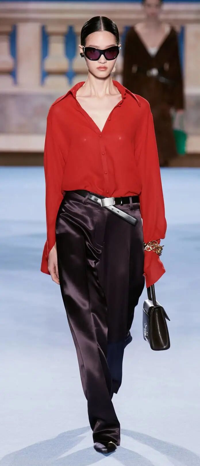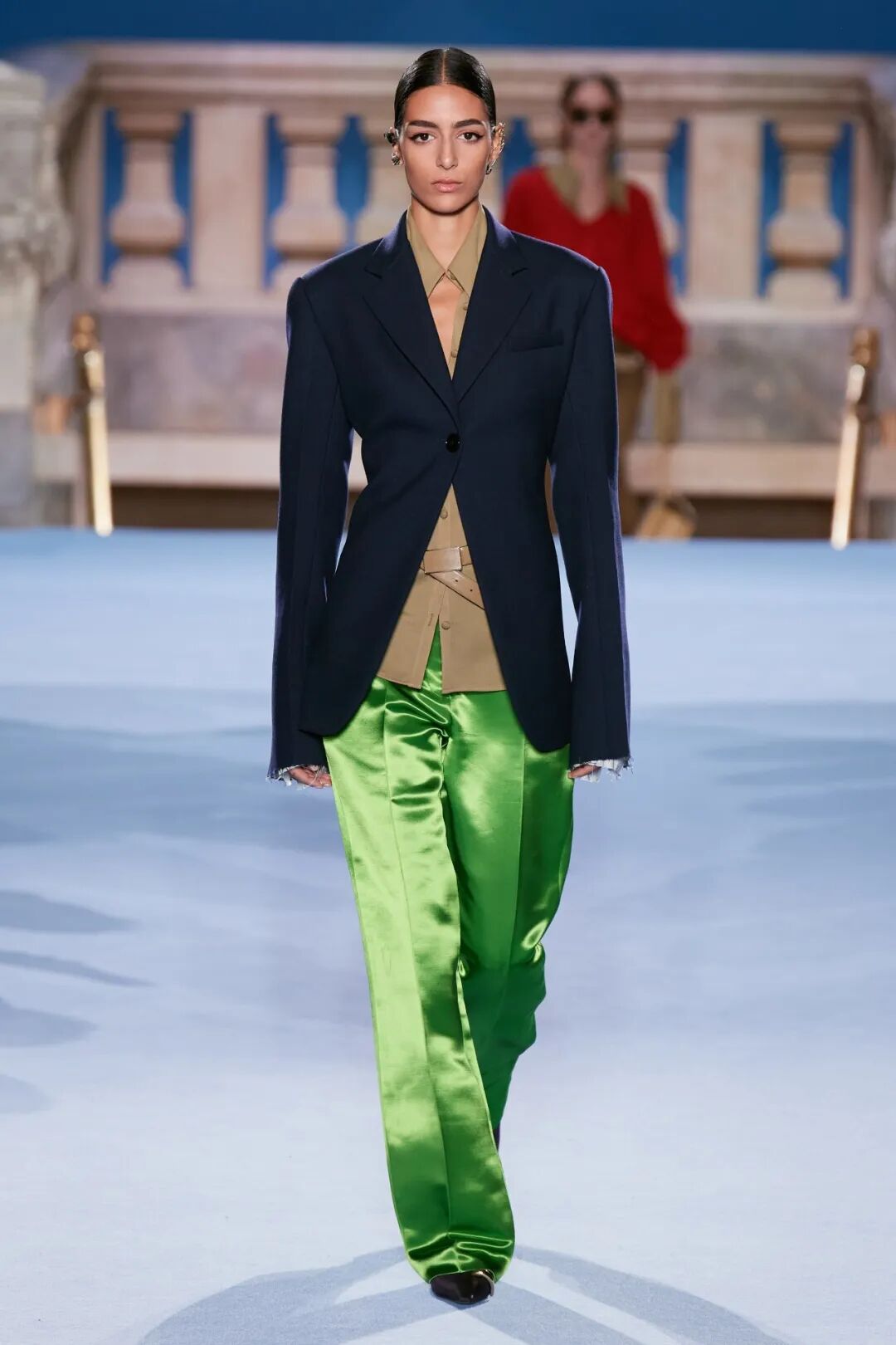 寬肩直身西裝,散發出慵懶隨性的氣質,與撞色寬鬆下裝搭配,完美詮釋本季秋冬摩登優雅的現代造型。