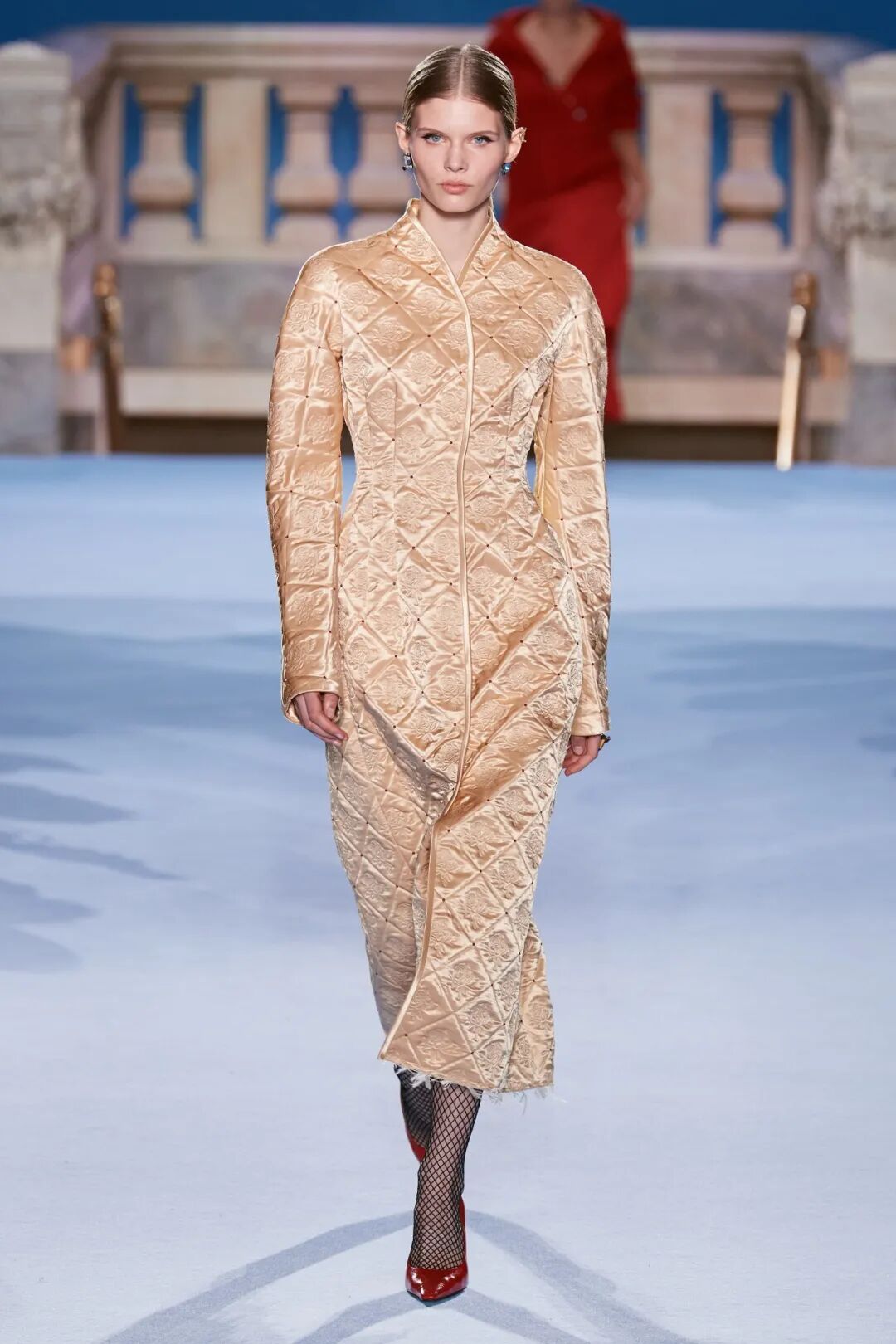 美式休閒的ToryBruch在23秋冬的多個造型上使用了奢華貴氣,光澤感十足的流光綢緞,壓花的工藝讓光澤感面料更具華麗,與其他質感單品的混搭撞色點睛,即使是較為基本的款式,流光質感的面料也使得整體造型華麗閃耀。