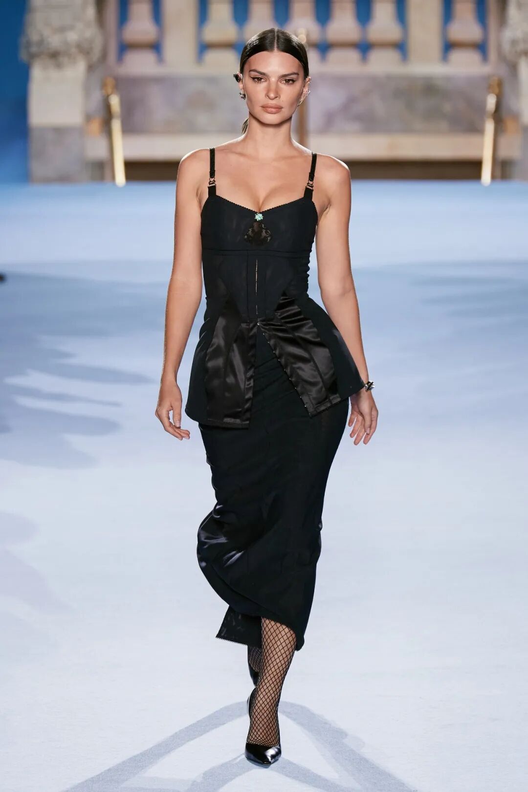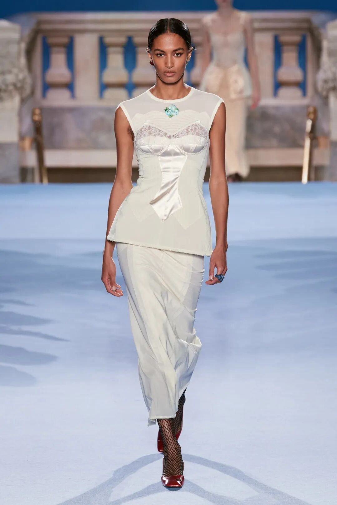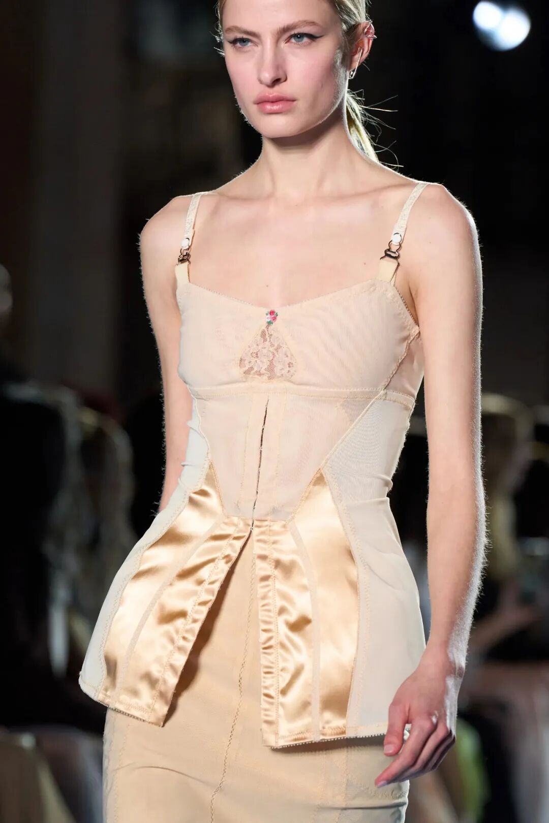 內衣外穿的結構,即女士內衣、內襯結構、安全飾針等內飾細節顯露於外,可凸顯女性的柔美特質,表現出最佳的女性曲線,以女士內衣為靈感的網紗連衣裙與蕾絲嵌飾背心,配以外露式骨撐、鉤扣與刺繡玫瑰花結,傳達著“隨心所欲”的穿衣法則。