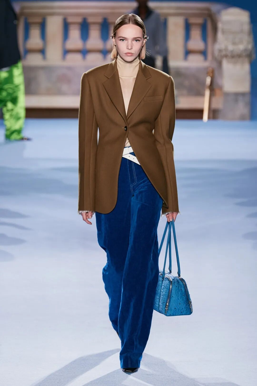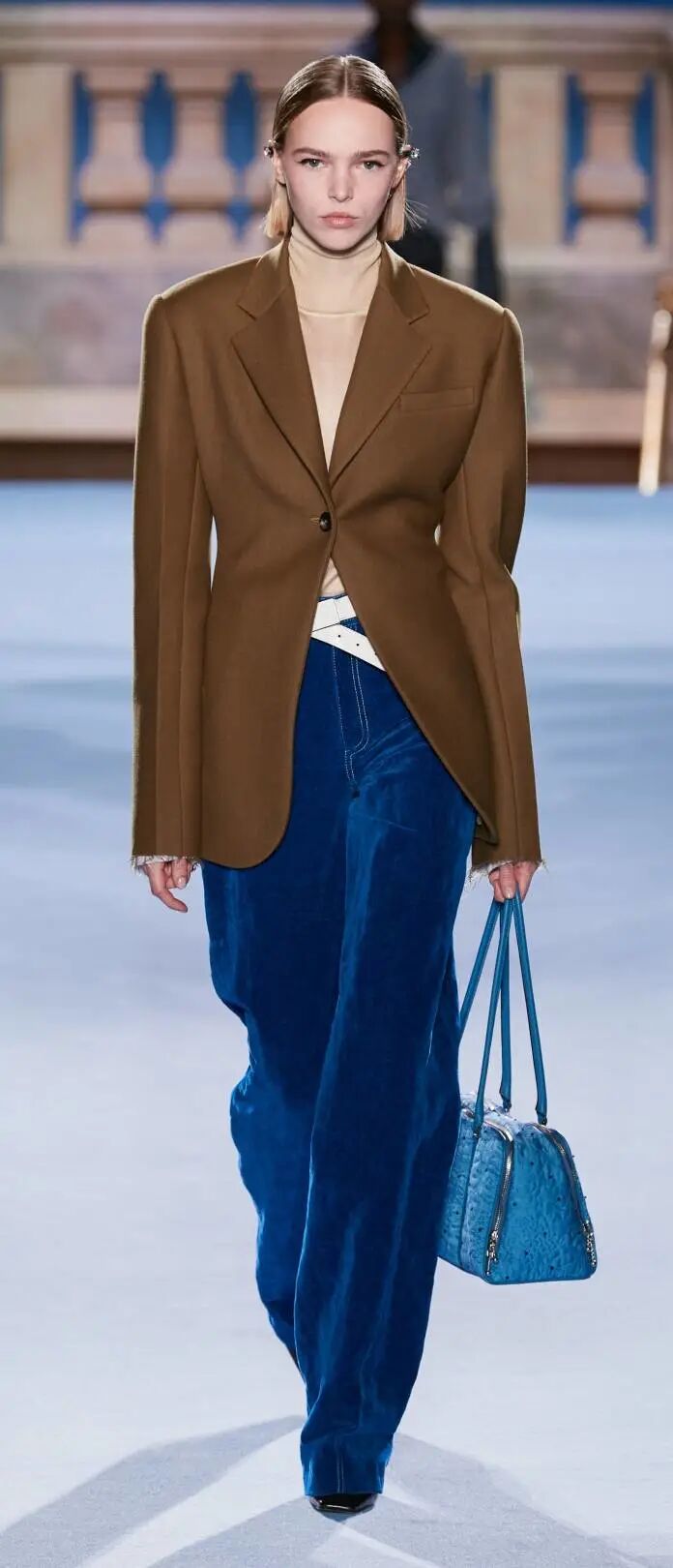 不同於大廓形的寬肩直身西裝,修身西裝更凸顯腰部的曲線,與撞色的內搭融合更顯都市先鋒,長及指尖的袖子、富有肌理感的面料、鬆散毛邊的袖口,散發出慵懶隨性的氣質,與撞色寬鬆下裝搭配,完美詮釋本季秋冬摩登優雅的現代造型。