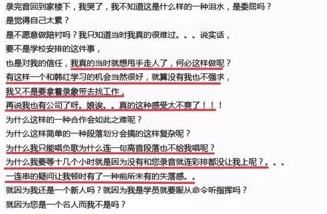 她把所有情緒都發洩到了公開的博客上,還在裡面爆料韓紅疑似耍大牌不配合排練…