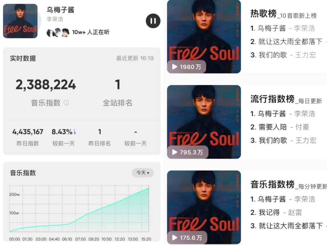截至2月21日,這首歌霸榜了QQ音樂、網易雲音樂的熱歌榜和熱搜第一位,其中QQ音樂同時收聽人數超過13w,收藏人數超過300萬。