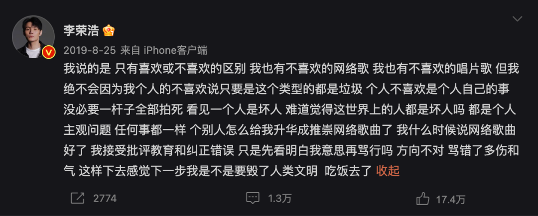 以至於,李榮浩當天又發了條微博解釋,說自己也有不喜歡的網絡歌,也有不喜歡的唱片歌,但是個別人給他昇華成了推崇網絡歌曲。