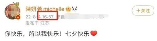 比如說:這兩個人在七夕節當天都發布了一條微博,時間僅僅相差了5秒鐘。