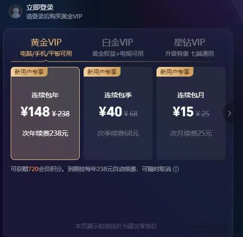 同理,多設備登陸一直都是共享賬號的重災區,畢竟“一人辦會員,全家皆享受”。限制多設備同時登陸,就是限制用戶共享賬號,進而釋放更多的需求。根據愛奇藝官網公佈的數據顯示,相比“黃金VIP”238元、68元、25元的連續包年、包季、包月價格,“白金VIP”相應的價格分別高出了110元、30元、10元。
