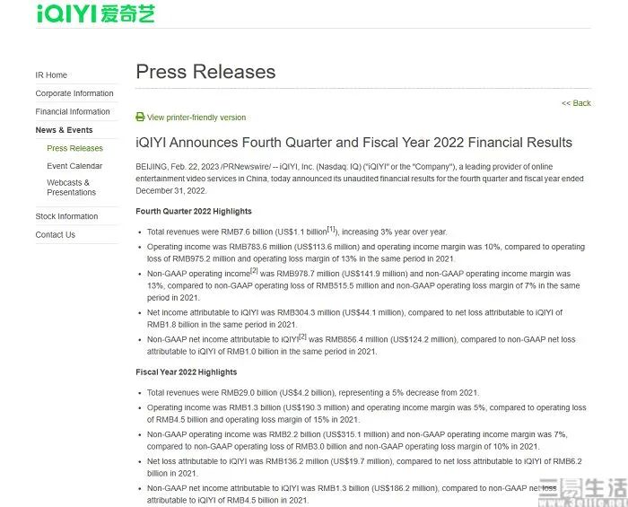 日前,愛奇藝方面發佈2022年第四季度及全年未經審計財報。其中顯示,2022年第四季度其營收為76億元、環比同比均有所增長,Non-GAAP運營利潤為9.79億元,實現連續四個季度運營盈利,Non-GAAP淨利潤為8.56億元、同比扭虧為盈。在2022年全年,愛奇藝Non-GAAP淨利潤為13億元、上年同期為淨虧損45億元,首次實現全年盈利。據瞭解,四季度愛奇藝在會員收入、運營利潤、運營現金流和和自由現金流等多個維度創下歷史記錄,其中會員數達1.2億、運營利潤率連續五個季度增長、運營現金流連續三個季度為正。
