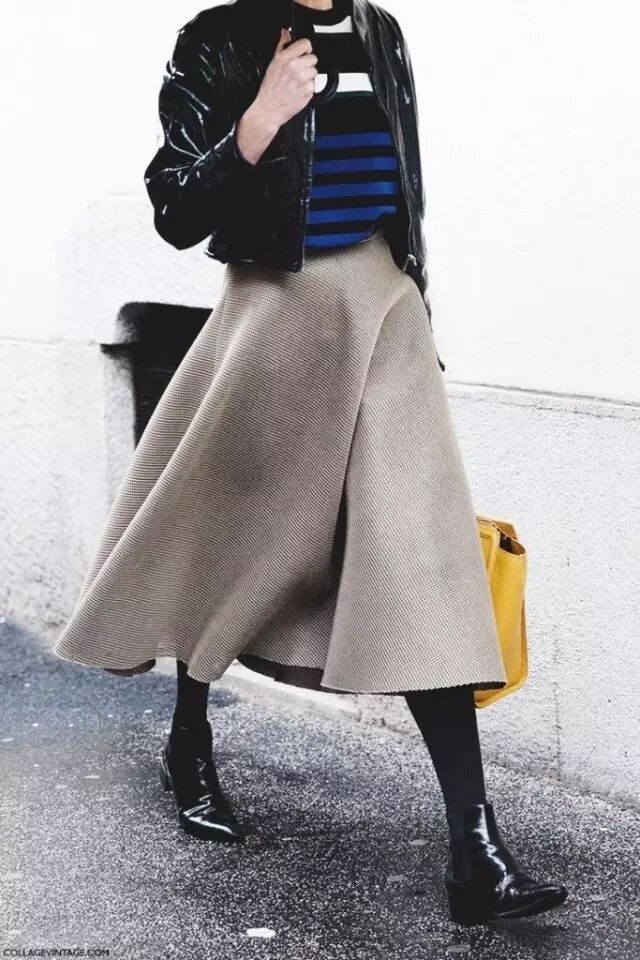 如果覺得純色毛衣太過千篇一律,可以選擇條紋毛衣來與闊擺傘裙組cp,充滿法式風情又更具復古腔調。
