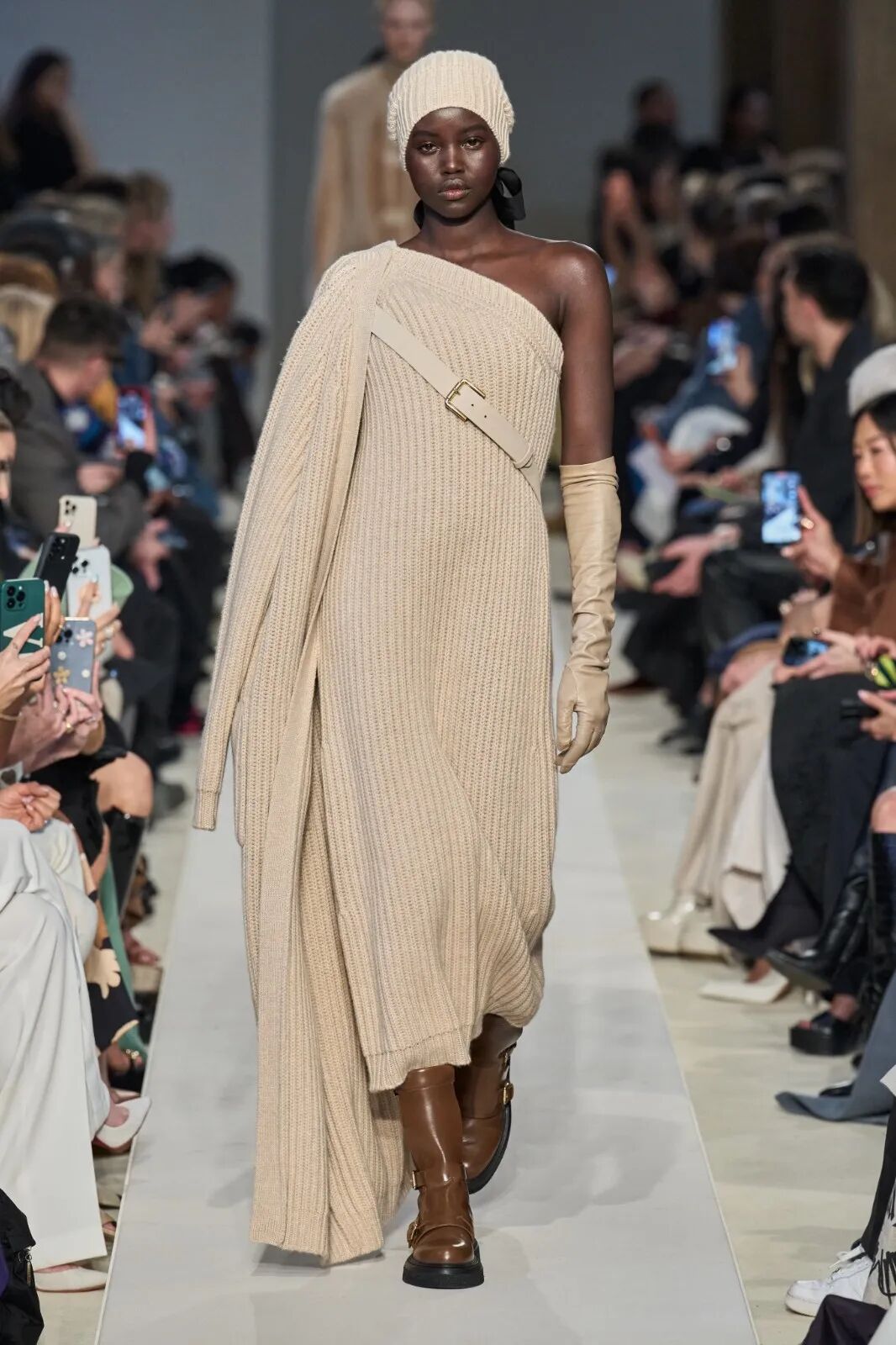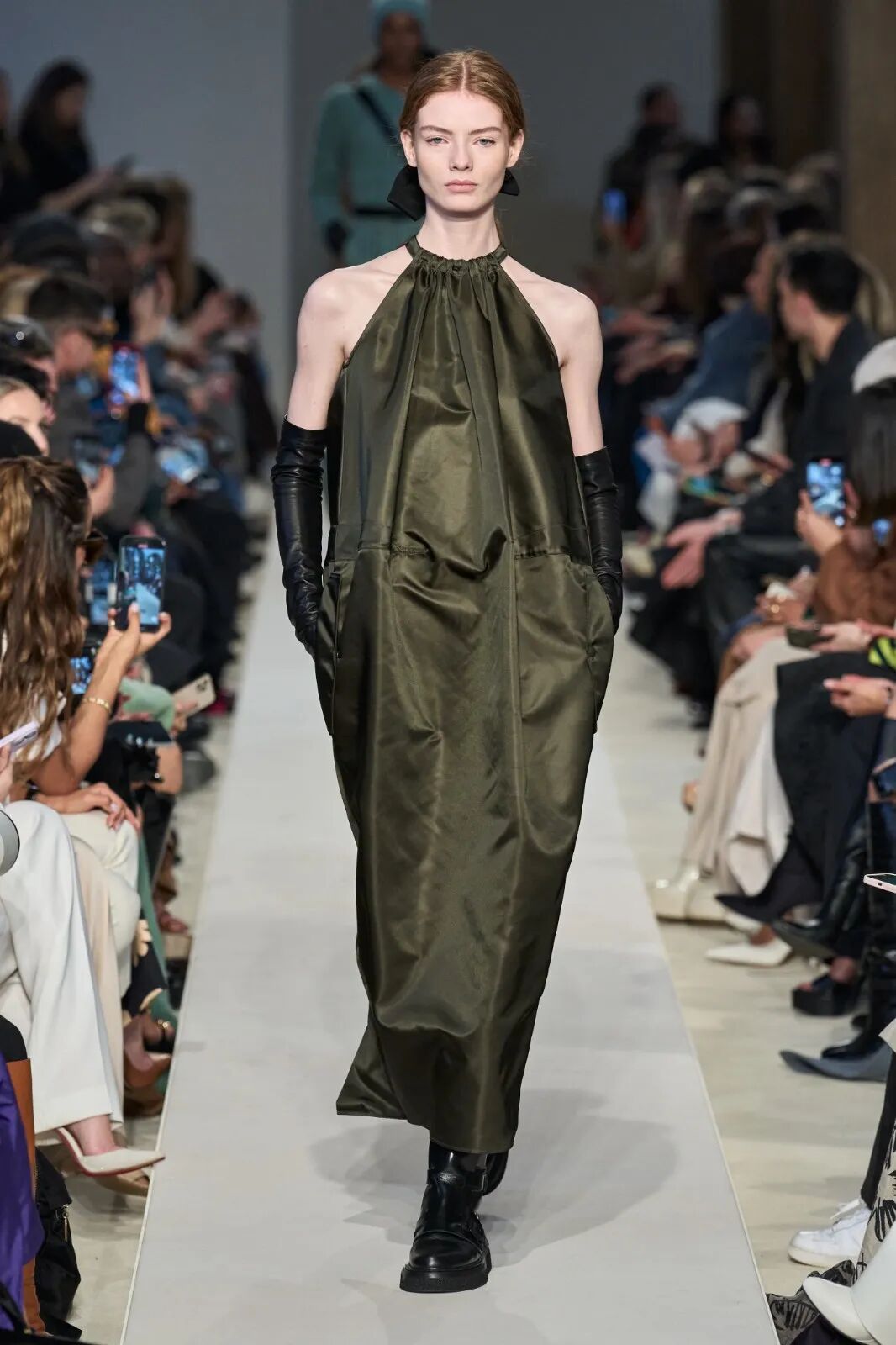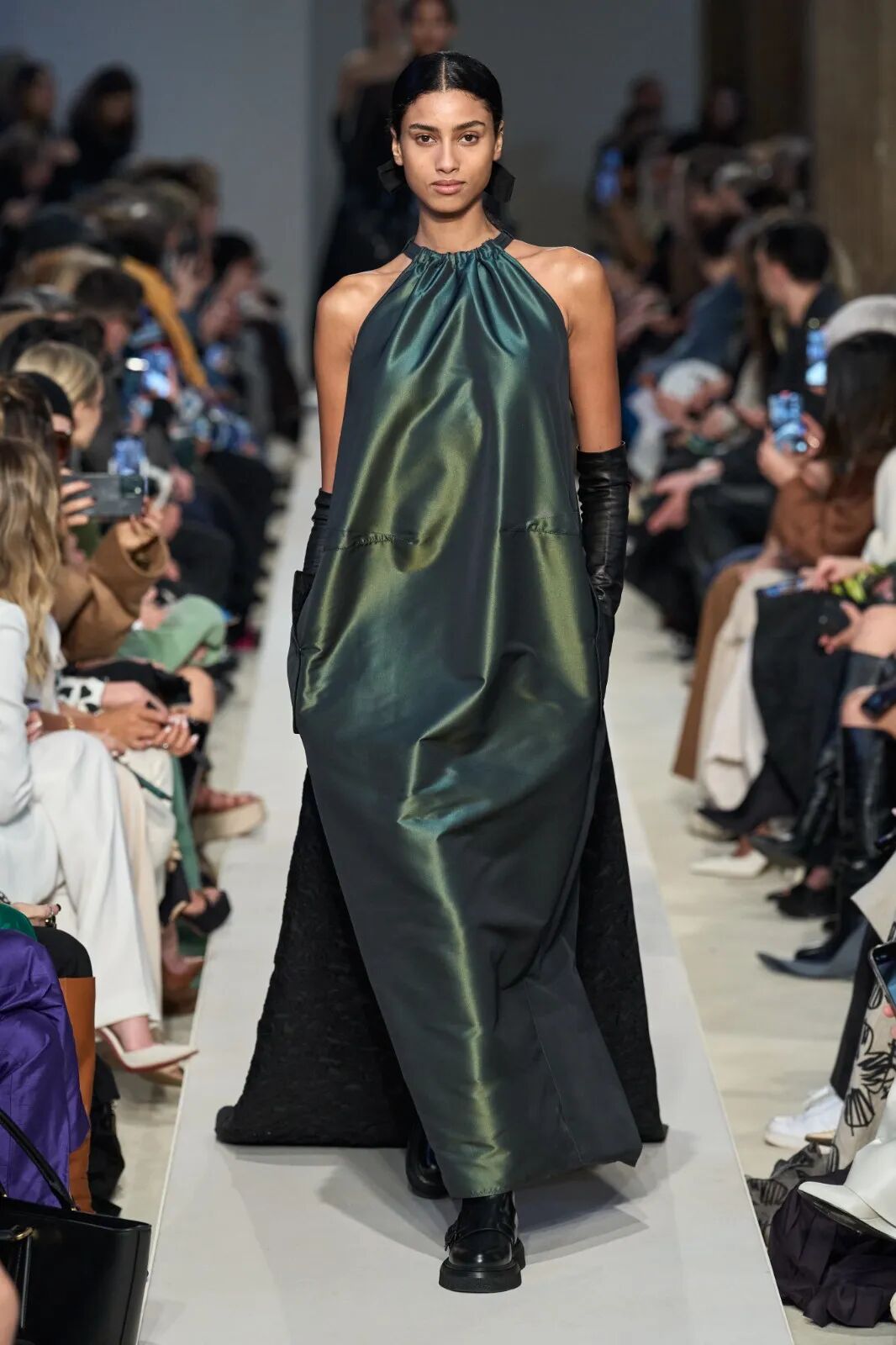 伏爾泰曾談及,艾米莉厭惡迷信和巫術。但啟蒙運動時期的時尚承載著許多源自黑暗時代的迷信元素,包括寬鬆垂褶、羽毛、馬鬃、鯨骨、用於儀式的面部塗飾,以及高聳的假髮……所以在 Max Mara 的敘事中,艾米莉對當時紛繁複雜且充滿約束的時尚風格秉持著鄙夷的態度。