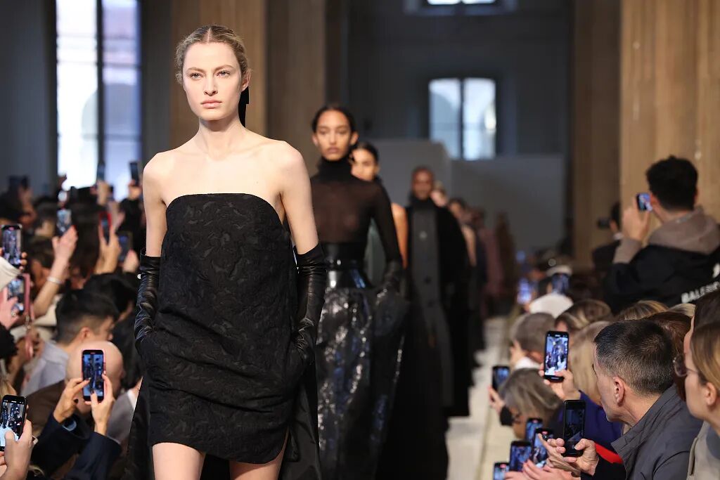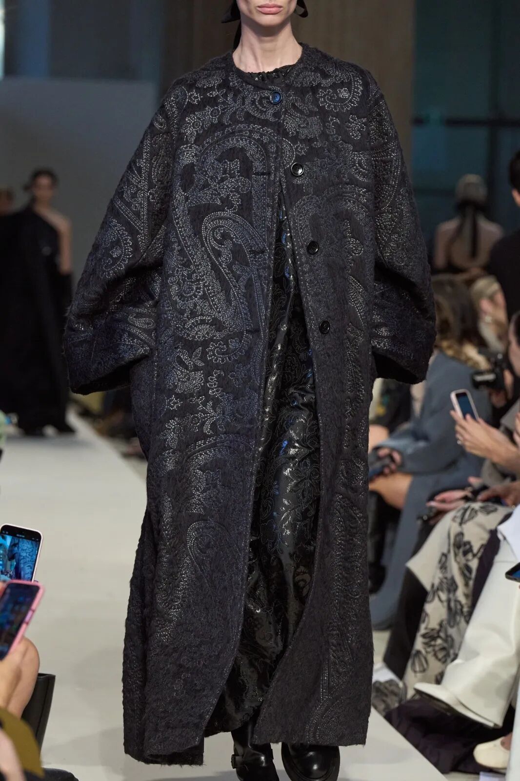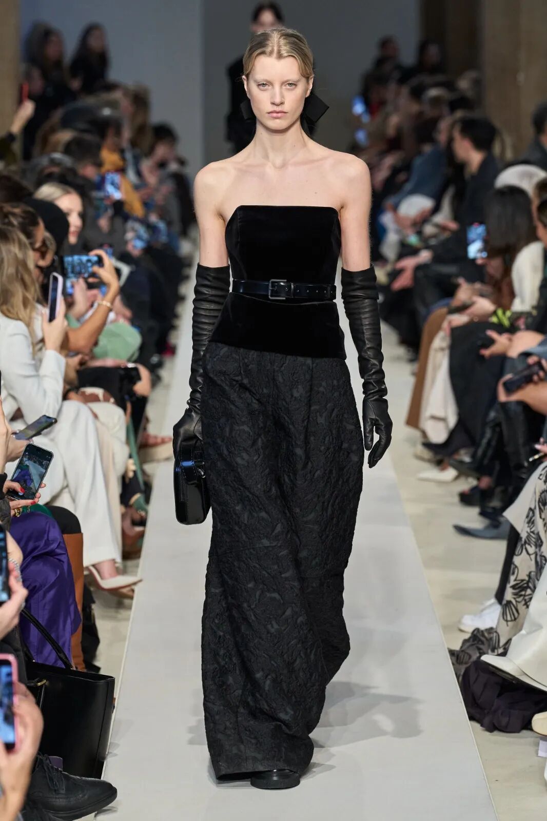 伏爾泰曾談及,艾米莉厭惡迷信和巫術。但啟蒙運動時期的時尚承載著許多源自黑暗時代的迷信元素,包括寬鬆垂褶、羽毛、馬鬃、鯨骨、用於儀式的面部塗飾,以及高聳的假髮……所以在 Max Mara 的敘事中,艾米莉對當時紛繁複雜且充滿約束的時尚風格秉持著鄙夷的態度。