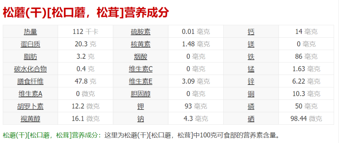 松茸富含膳食纖維、維生素A、維生素C、維生素E、胡蘿蔔素、視黃醇、b族維生素以及鉀、鈣、鐵等礦物質元素。