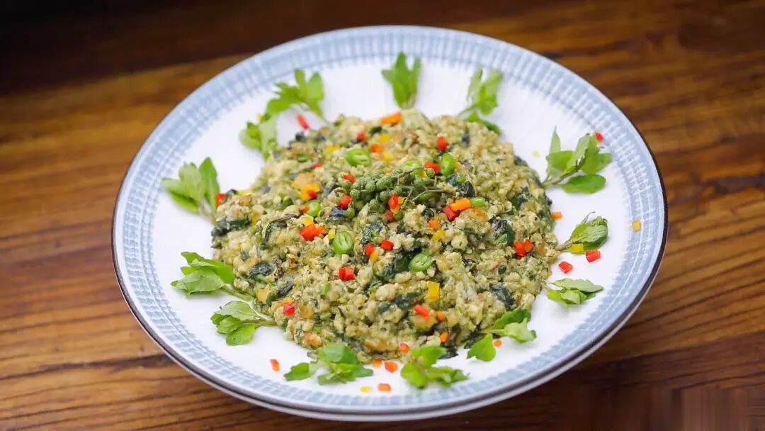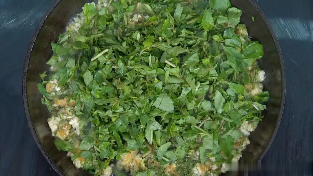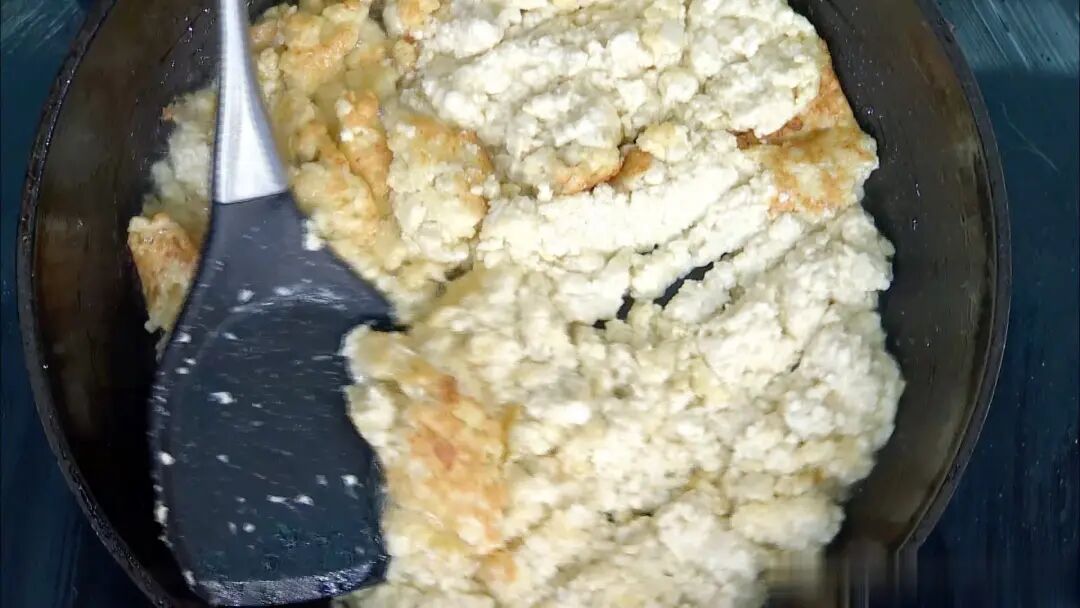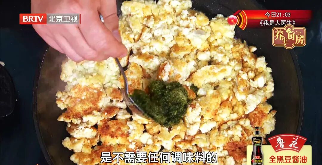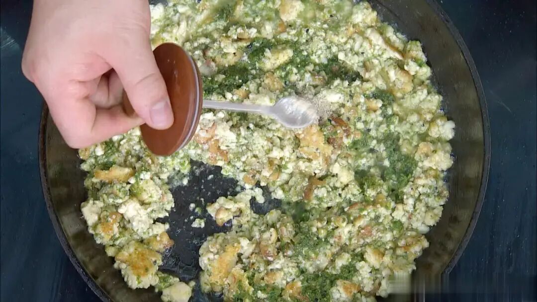 六成油溫,下入豆腐碎,煸炒至上色,放入調味醬燒製,加入鹽、少許醬油、香油,出鍋前放入枸杞芽碎,翻炒均勻即可。