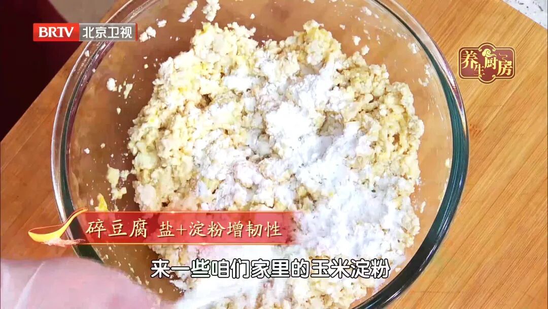 豆腐捏碎,加入山藥碎、雞蛋攪拌均勻,放入玉米澱粉、鹽、胡椒粉調味。
