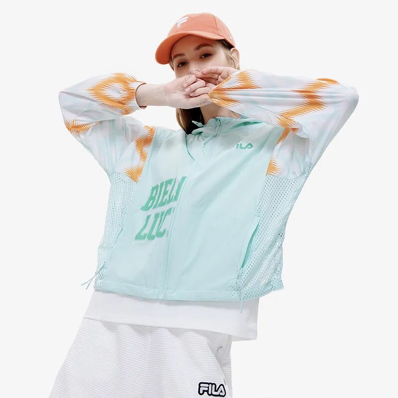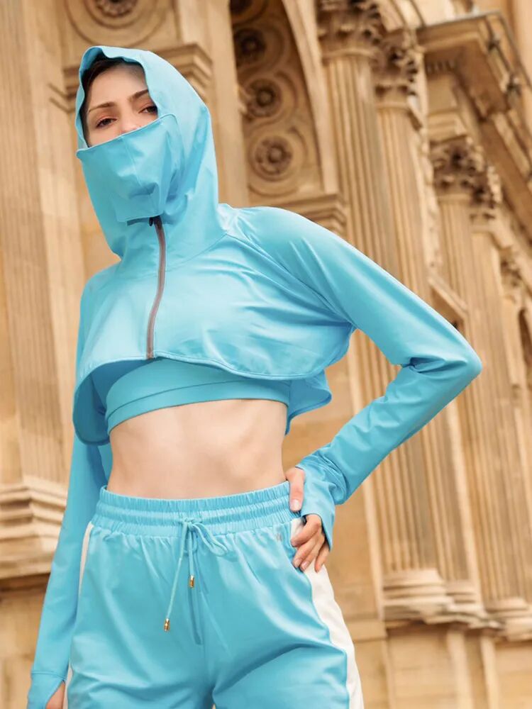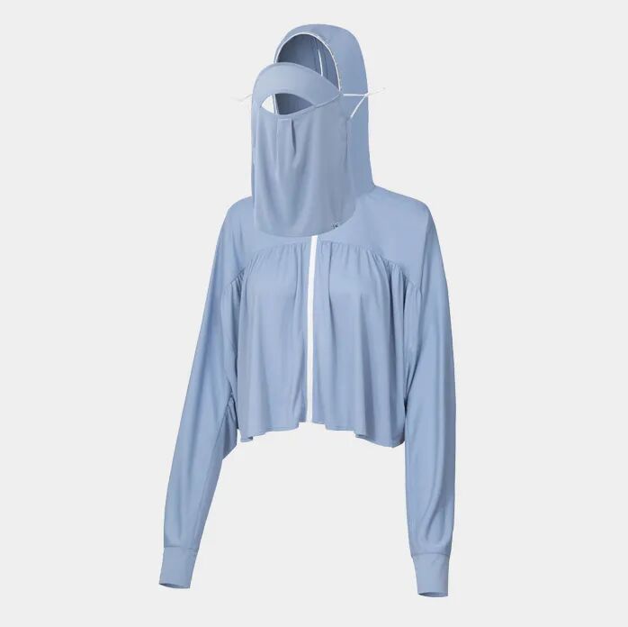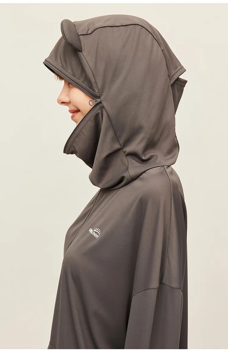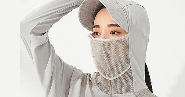 將戶外功能性面罩的巴拉克拉法帽融入防曬服中,也被玩出了新花樣,將面罩換成網紗材質很好的解決了透氣悶熱等問題,全頭包裹式的防護也成為了國內熱門防曬裝扮,適當加入小耳朵令單品活躍起來。