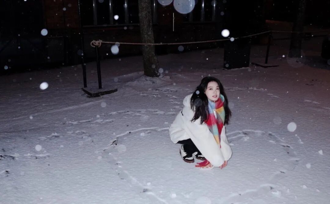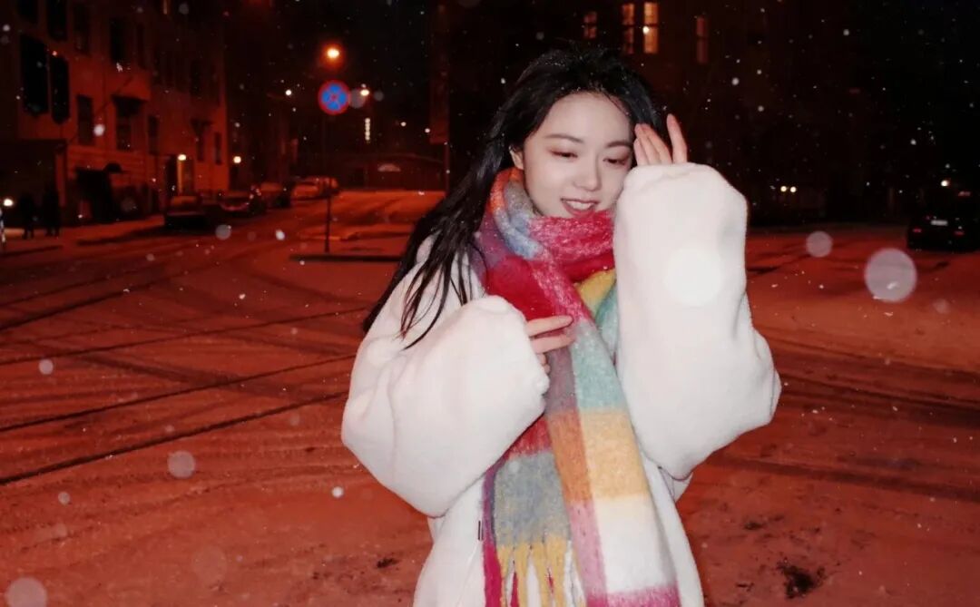 最近,趙今麥放出置身於芬蘭雪景之中的照片。穿著白色毛毛外套,搭配彩色圍巾,映襯著飄揚雪景,一切美好安寧。
