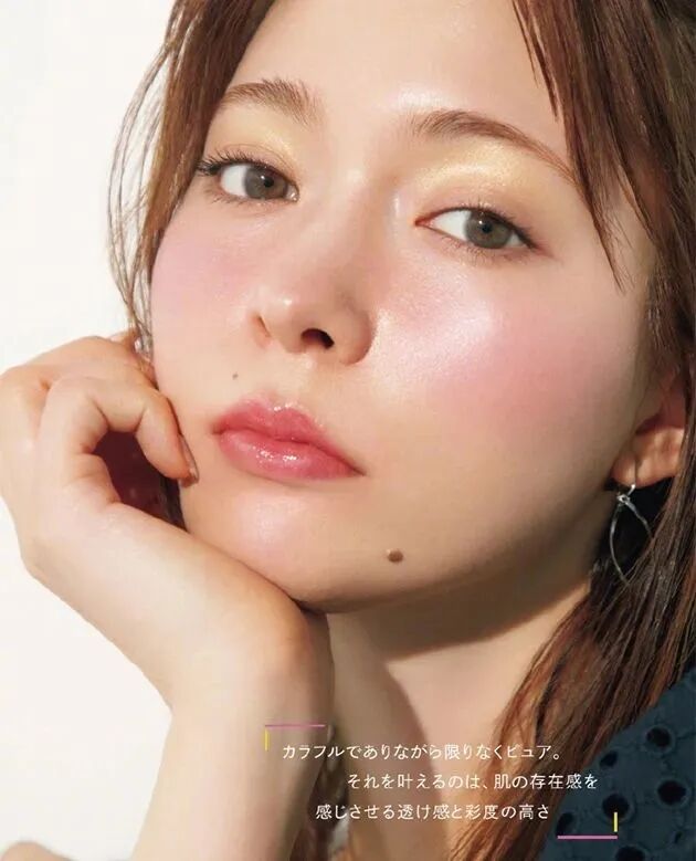 髮色比較深的姐妹可以考慮粉色眼影和腮紅一起暈染,打造粉撲撲的少女感妝容。腮紅打在眼下和臉頰外緣,會更有楚楚可憐的溫柔感。