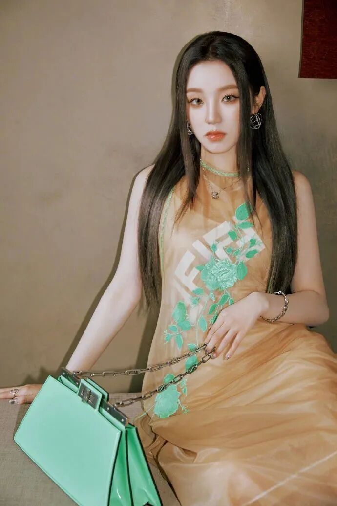 橘色輕盈薄紗長裙,明媚綠色點綴,搭配橘色調眼妝和珊瑚橘果凍唇,長髮利落優雅,變身剛柔並濟的摩登女郎。
