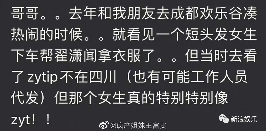 還有網友爆料曾偶遇過疑似周雨彤的女生和翟瀟聞一起去成都歡樂谷玩↓