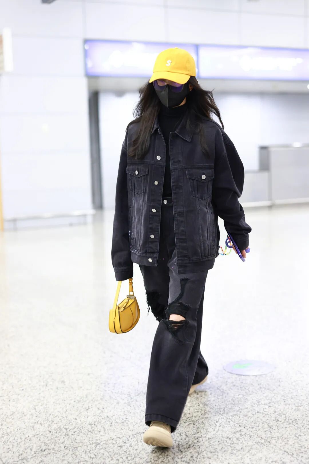 黑色破洞牛仔褲很酷哦,剛好可以中和詩詩溫柔的氣質;檸檬黃的鴨舌帽和包包呼應,整體造型清新又有活力。