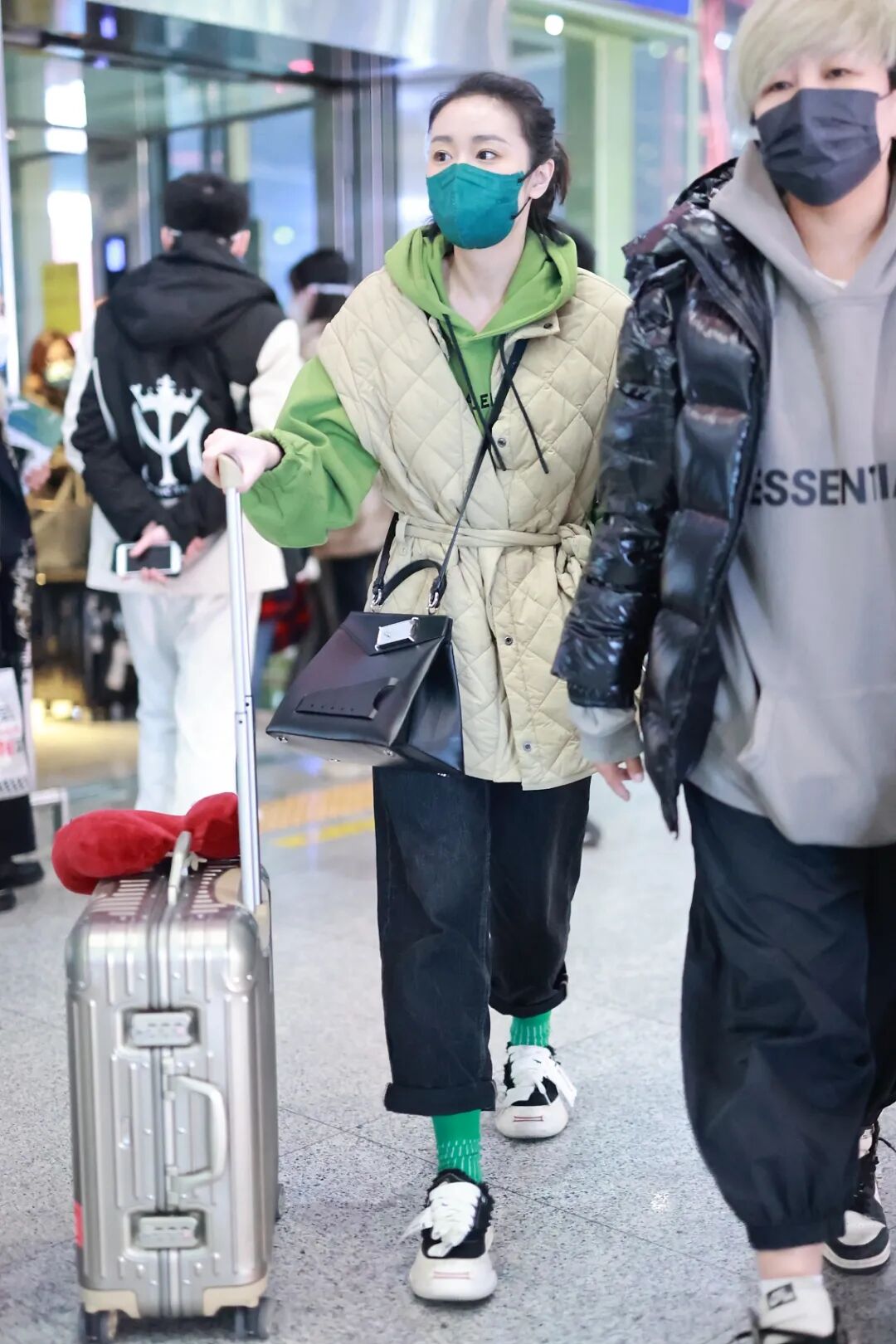 小清新風大嫂來襲!綠色衛衣疊穿羽絨馬甲的方式很有活力,口罩居然和襪子呼應起來了,這是要從頭到腳都時髦哇,報友們有認出她是《狂飆》中的“陳書婷”嗎?