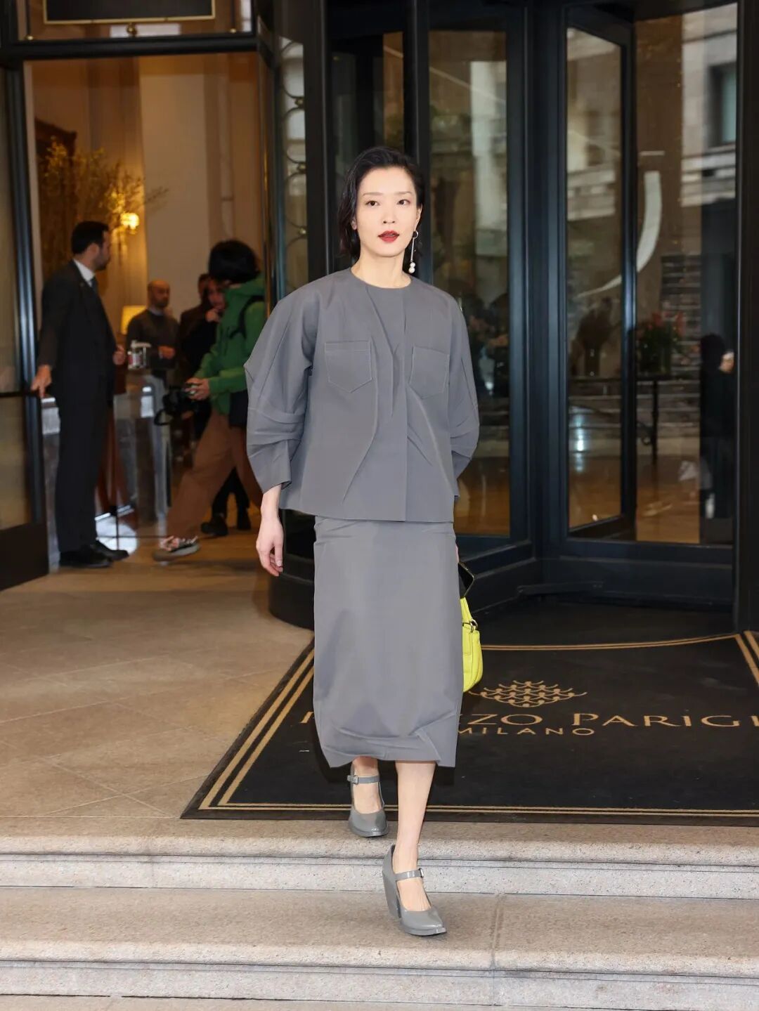 看秀Look是一套灰色裙裝,有點工裝feel,搭配同色系瑪麗珍小皮鞋,復古又時尚,混搭黃綠色小包好特別。