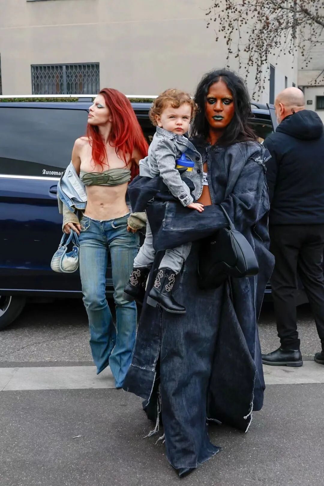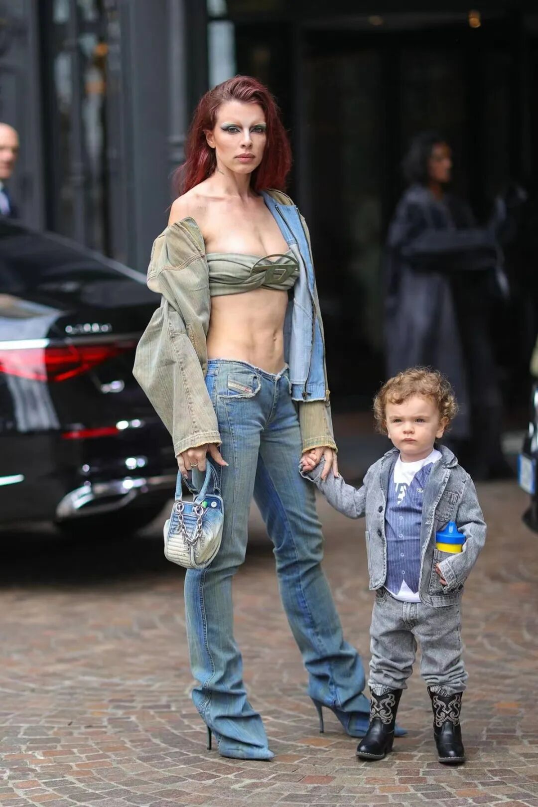 時裝週秀場外的朱姐只有更狂野,淺綠色bra配低腰褲和尖頭鞋有千禧年那味兒了,加上一頭海王紅長髮,森林公主即視感。