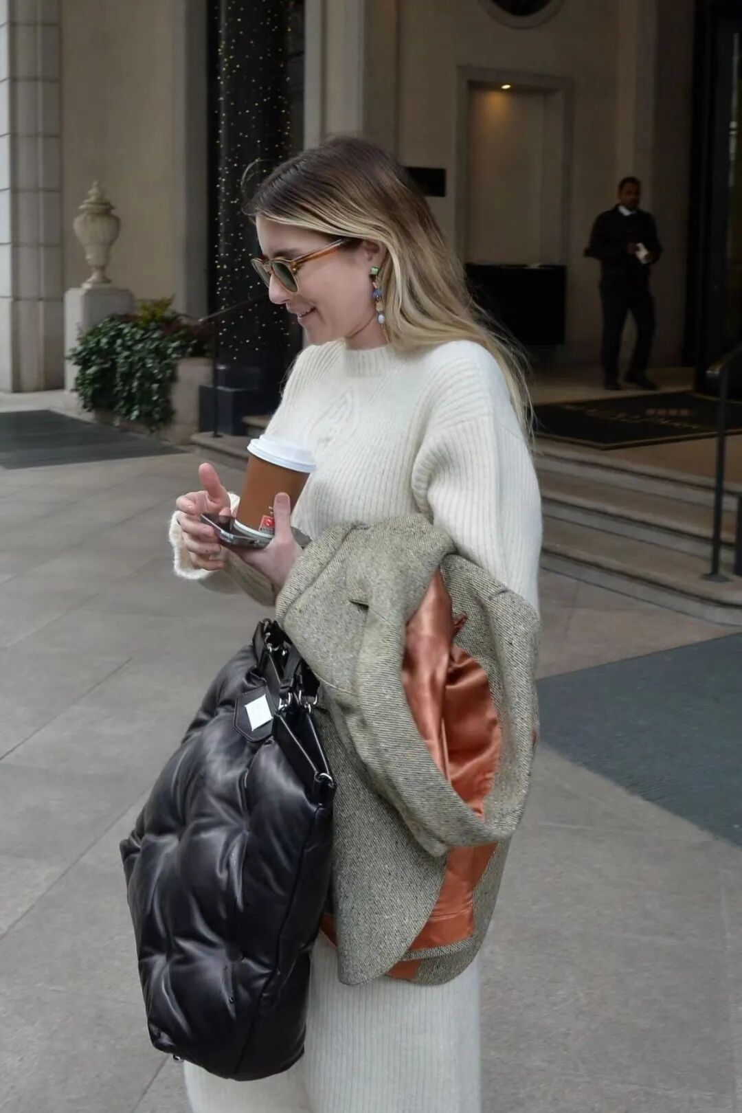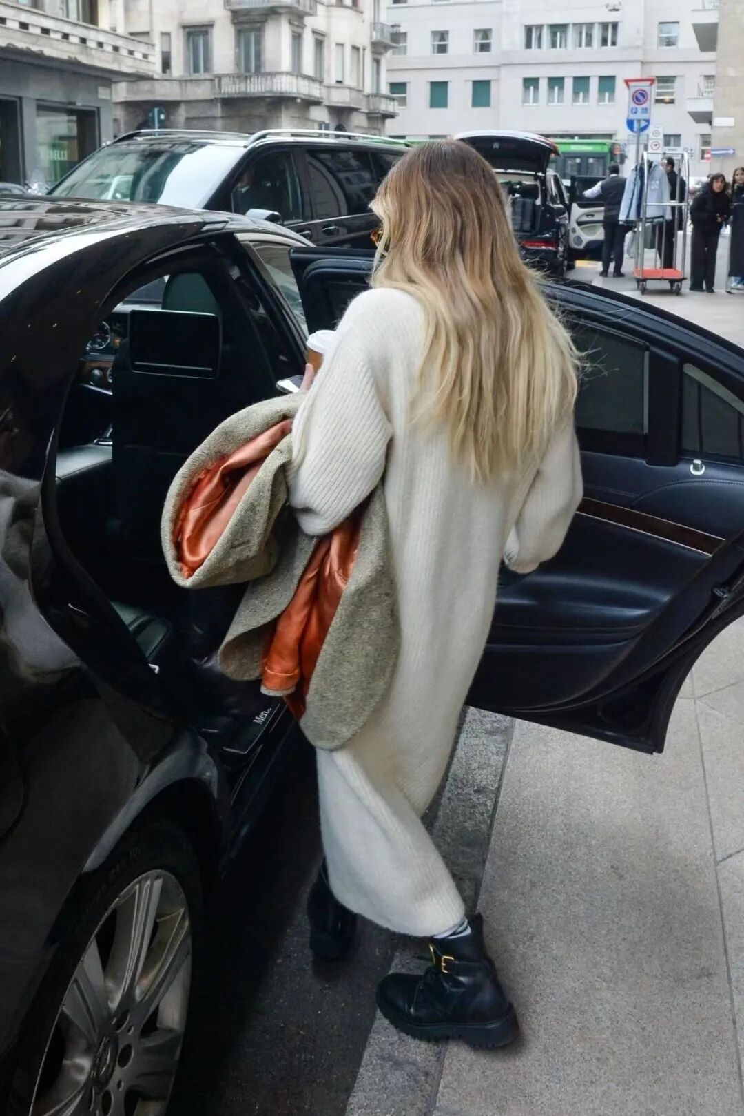 喬妹則是前往米蘭參加時裝週。這一身也相當輕鬆,加上Fendi家的老花圍巾作為亮色點綴也很耐看。