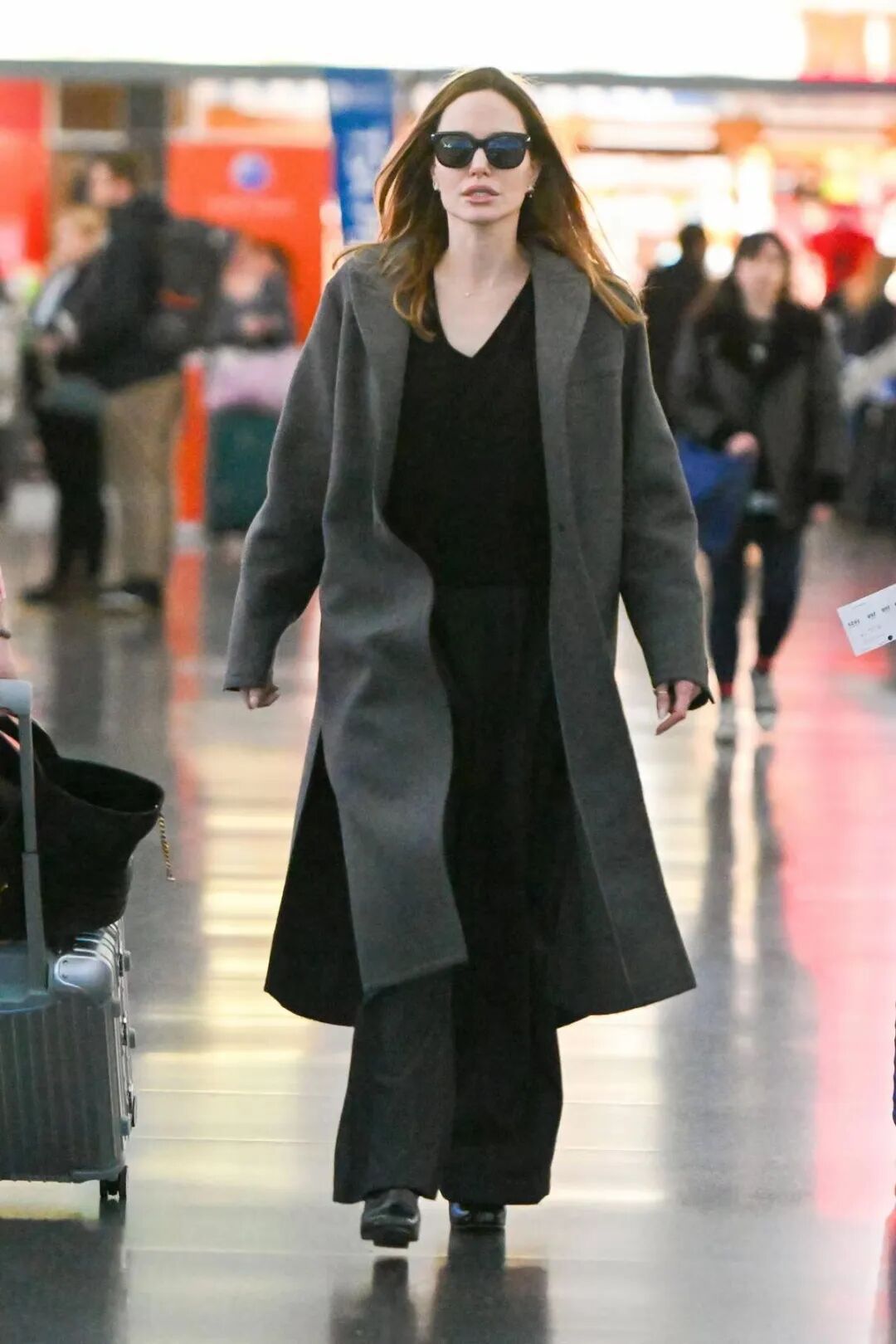 朱莉那個YSL的超大包包又現世了!感覺趕飛機裝行李很好用誒。Look是深灰色大衣和黑色單品疊穿,高級又耐看。墨鏡一戴,女明星氣場全開嘛~