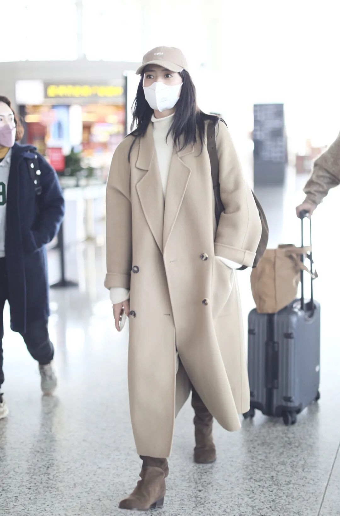 米色大衣配順色棒球帽和白色內搭,淺淡溫柔;咖色的長靴和包包呼應,同時也為整體添了一些層次感。