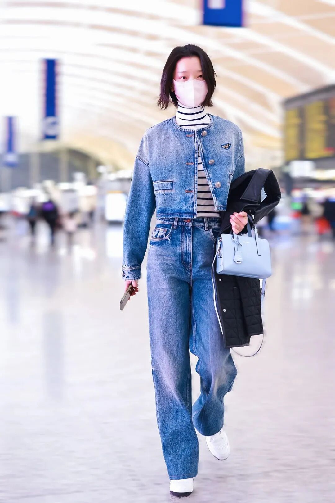 鵑姐也在趕路中,清清爽爽的牛仔套裝內搭條紋T很時髦,一看這身就知道是去米蘭看Prada大秀的啦