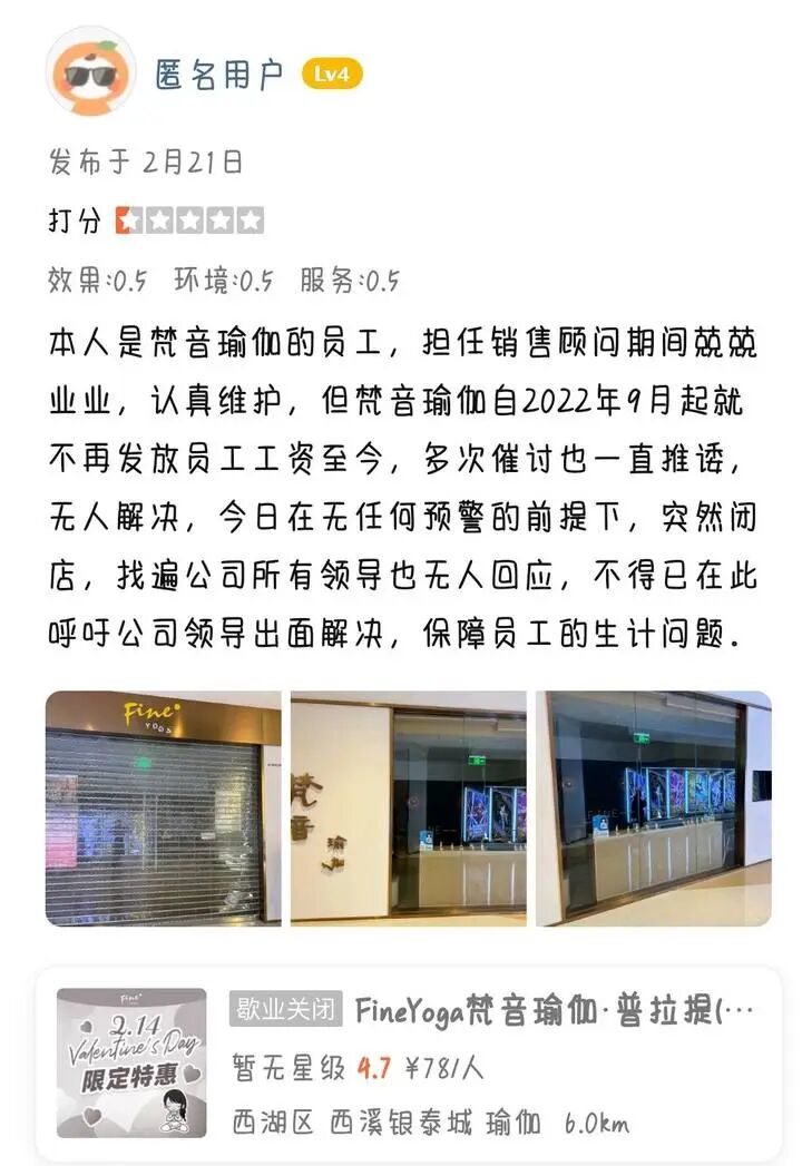 還有自稱是梵音瑜伽的員工,也在大眾點評上留言,說自去年9月起,公司就不再發放員工工資至今,且至今催討未果。