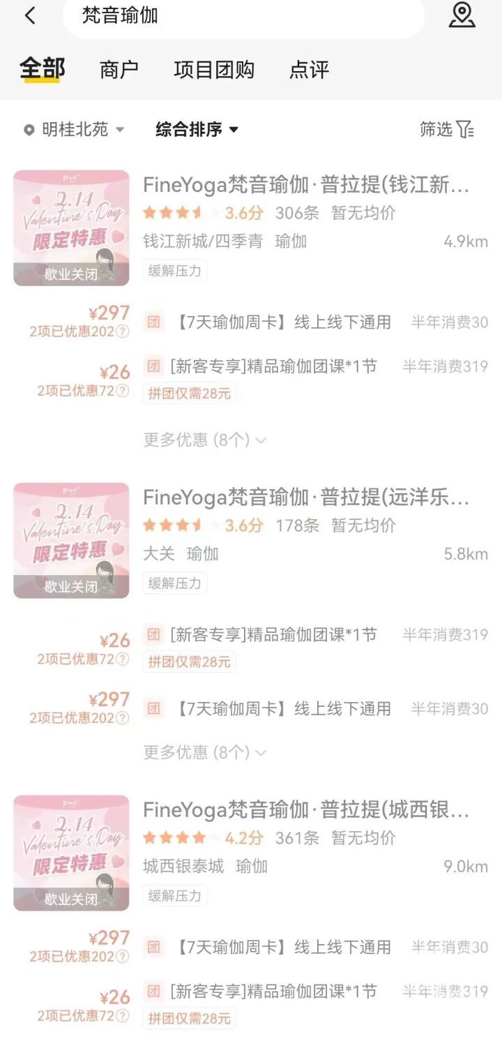 小陳說的瑜伽館叫“FineYoga梵音瑜伽”,在杭州擁有6家門店,卻在一夜之間全部閉館。