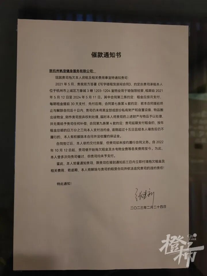 今天(2月25日)中午,橙柿互動記者去了趟位於華潤大廈B座12樓的梵音瑜伽錢江新城店,店門緊閉還上了鎖,門內一片漆黑,門上貼了兩張催款通知書,落款時間是2月24日。