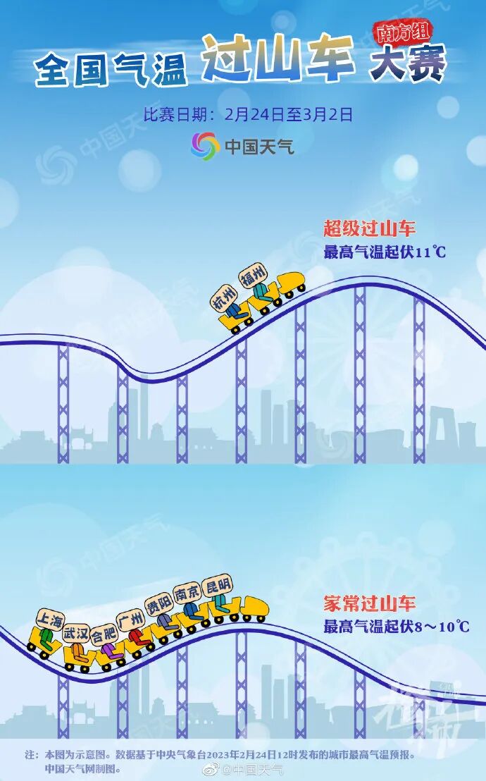 隨著兩股冷空氣先後影響我國(分別在24日至25日、26日至3月1日),一場激烈的氣溫過山車大賽拉開帷幕,20省份氣溫上演精分大戲,杭州氣溫代表隊也將坐上超級過山車,體驗隔天如換季。