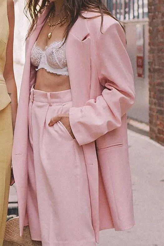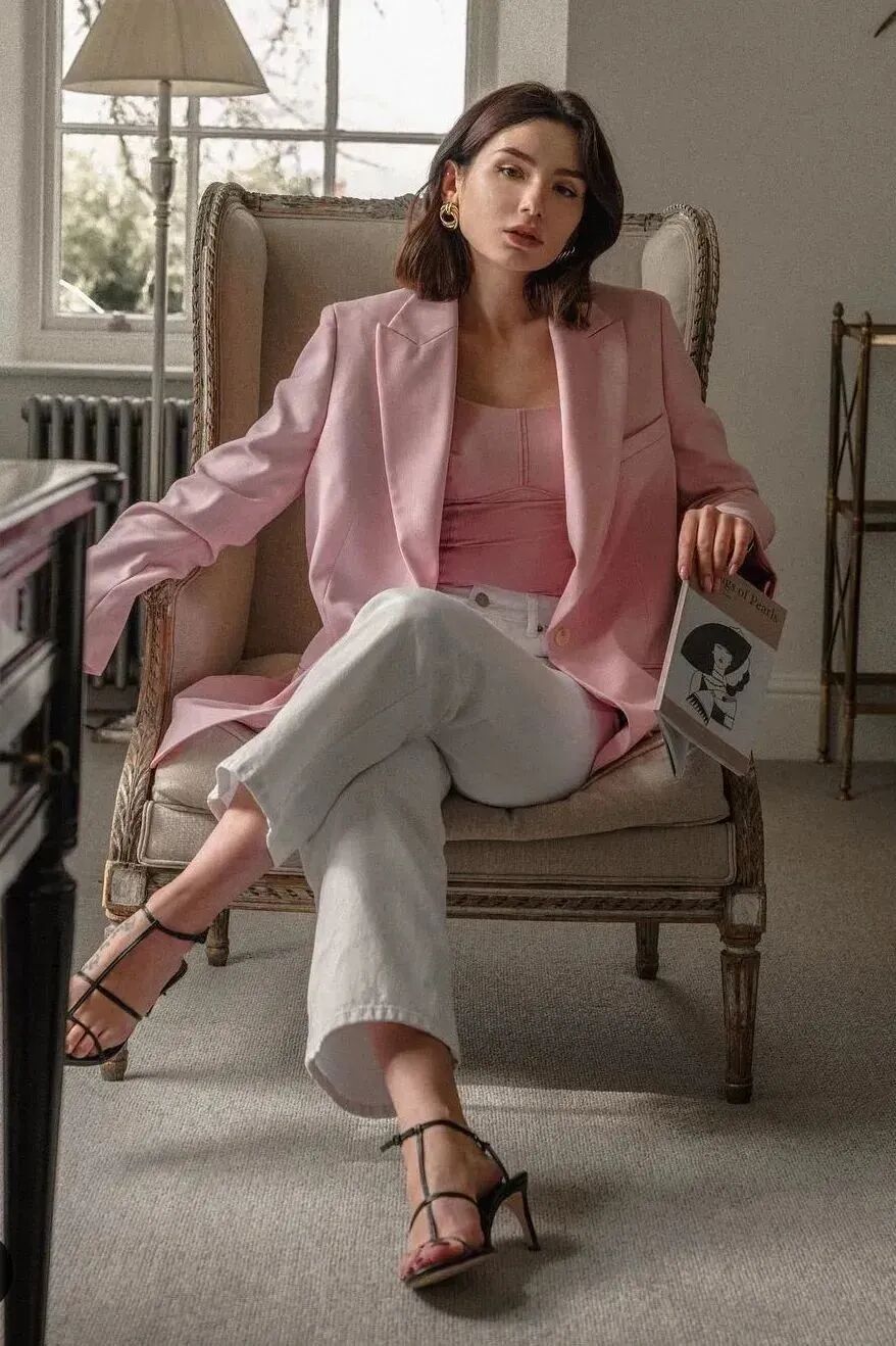 粉玫瑰色西裝無論是成套穿,還是搭配小白褲小白鞋,都非常乾淨清爽。
