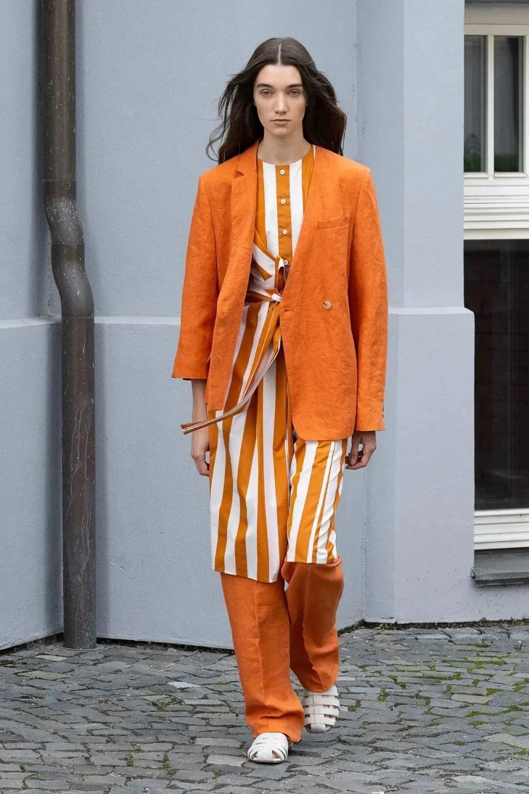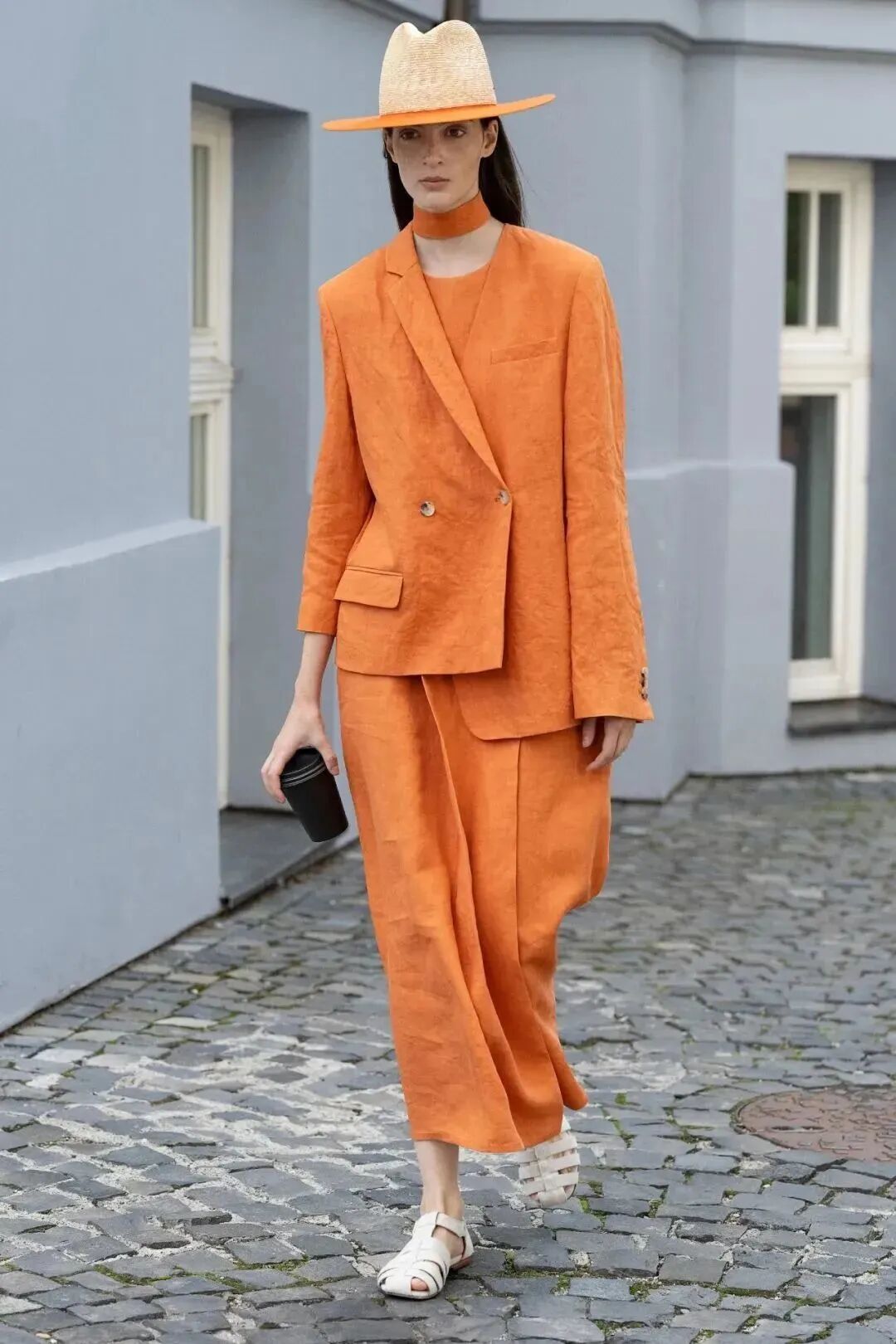 如果覺得橙色系難駕馭,可以嘗試與棉麻面料相結合。材質特性減弱了光澤感,再鮮豔的色彩也能夠穿得很自然。
