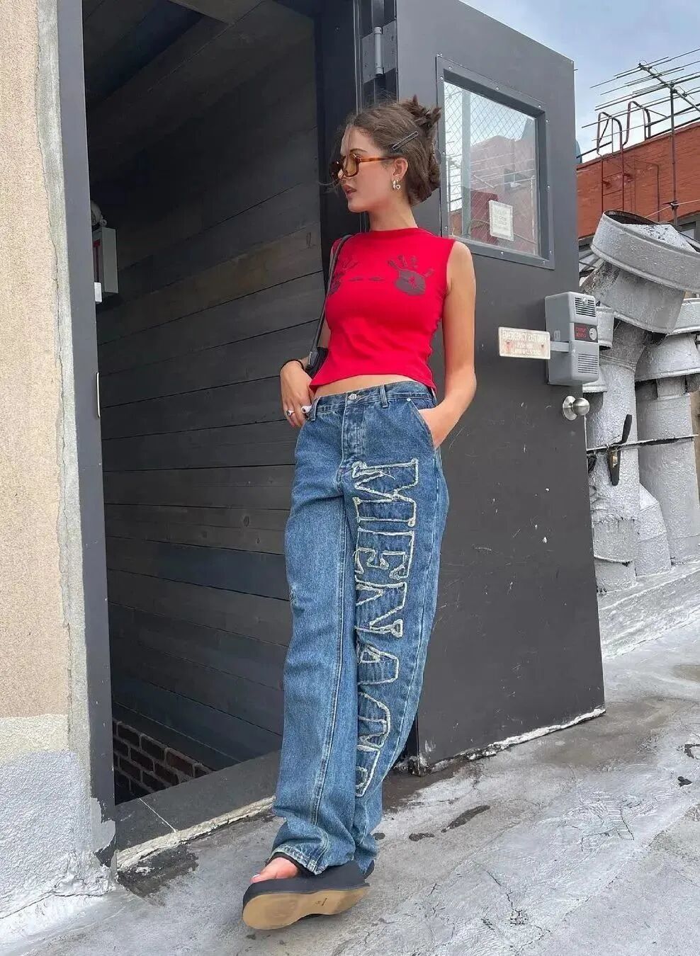 烈火紅的明度並不高,風格上更偏復古、優雅的感覺,因此非常適合搭配牛仔單品,輕鬆打造 90 年代的高級港風 look。