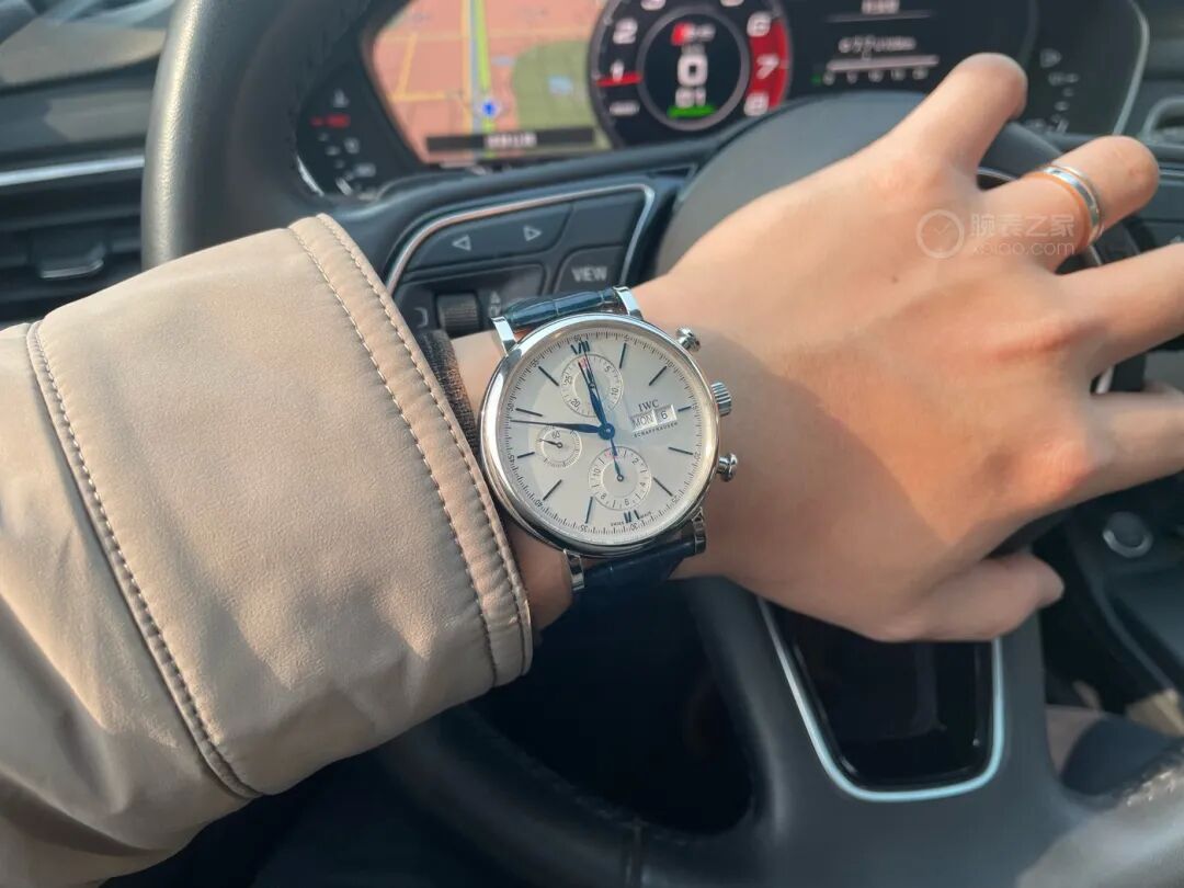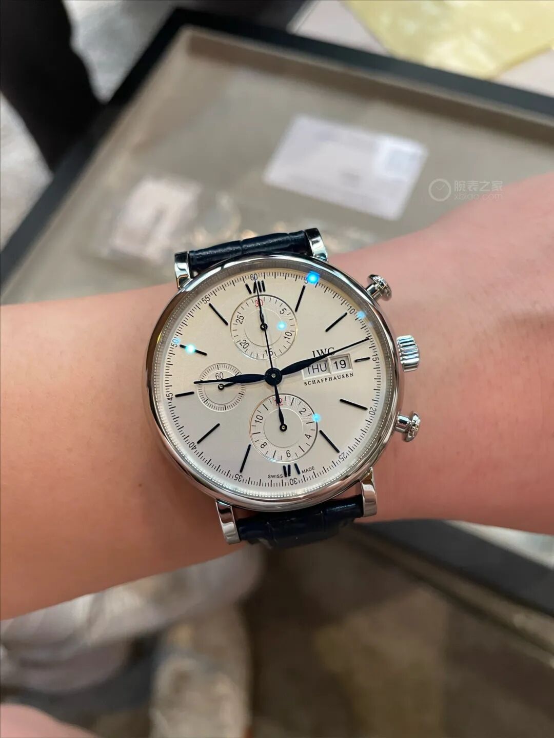 今年過年和老婆去了一趟海南玩,到了免稅店直奔鐘錶區,預算內只考慮歐米茄和萬國,先去了歐米茄看了海馬300米潛水錶,黑海馬和綠海馬都看上了,但是老婆給的建議是太運動範兒,不適合我平時的穿衣風格。在萬國專櫃的時候銷售給我推薦的第一隻表是葡萄牙計時白底藍針,很漂亮,當時立馬看上,同時又推薦了柏濤菲諾計時腕錶,也是白盤藍針,相比一下柏濤菲諾就遜色了很多。