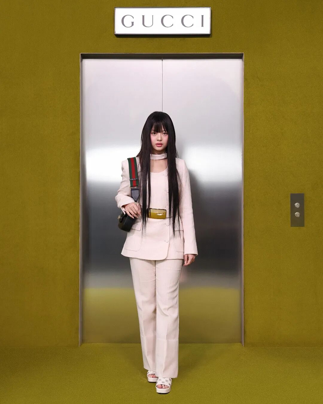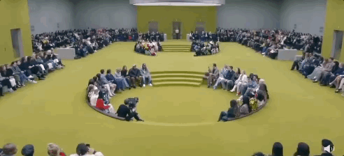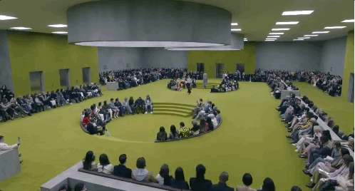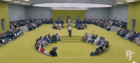 在品牌位於米蘭的Gucci Hub裡,整個場地被改造成了黃綠色,大秀開啟之前閃爍的白熾燈,頗具實驗風格。電梯將秋冬女裝系列從樓內各處送到秀場,各個時代經典的GUCCI元素跳躍在秀場上,一系列精心的設計依次呈現古馳最近的階段(1990年代-2010年代-當今)風格,觸動了記憶。