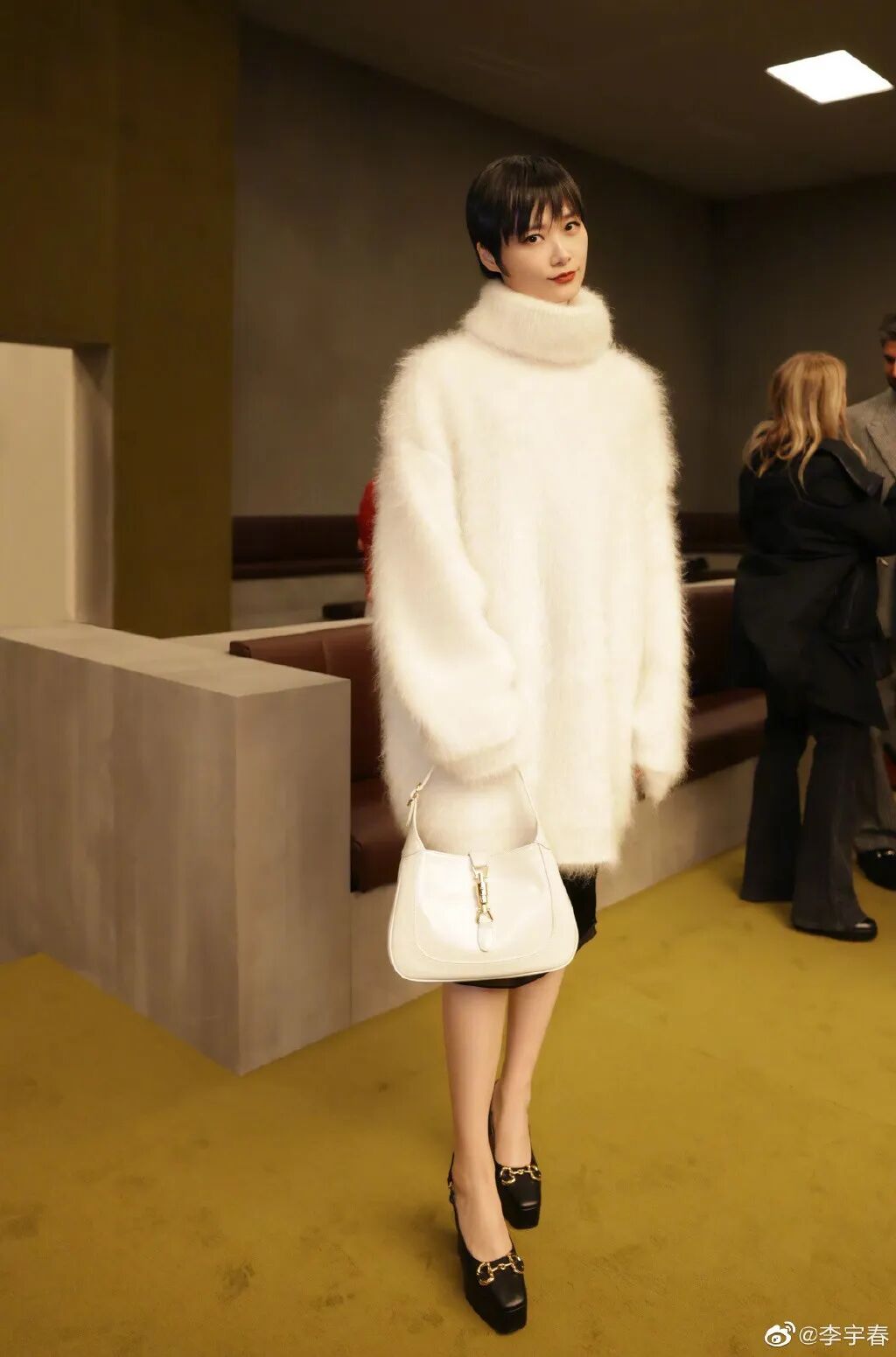 迴歸秀場,兩人的看秀造型也是相當精彩!時髦如李宇春率先演繹了GUCCI即將發佈的新款!白色oversize長毛毛衣配黑色紗裙,溫柔可人。