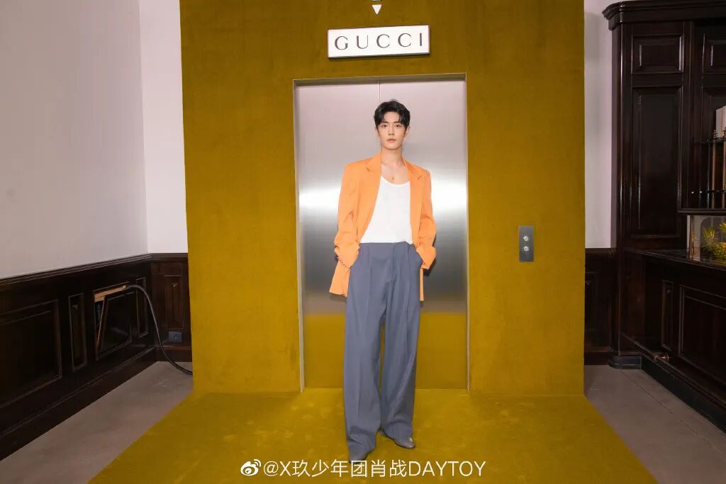 肖戰的這套造型則是來自GUCCI 23秋冬男裝秀場,雖橘黃色西裝視覺張力十足,但整體造型輕鬆、大方。