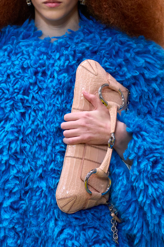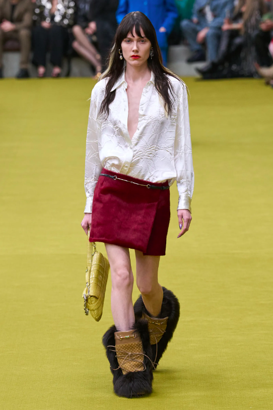 除此之外,秀場上的配飾也非常值得關注。馬銜扣出現在新款圓角梯形鏈條包上,包身嘗試軟墊、剪羊毛、水晶、蛇皮與拼色皮革煥新詮釋,原為1960年代滑雪服飾系列設計的雪地靴則飾以馬銜扣煥新亮相。